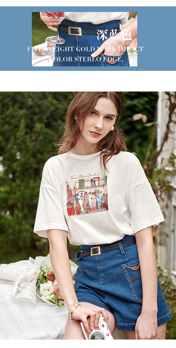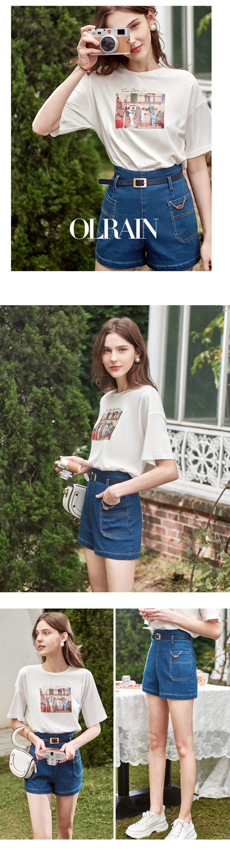 欧芮儿夏日清爽藏青色短袖上衣透气舒适百搭