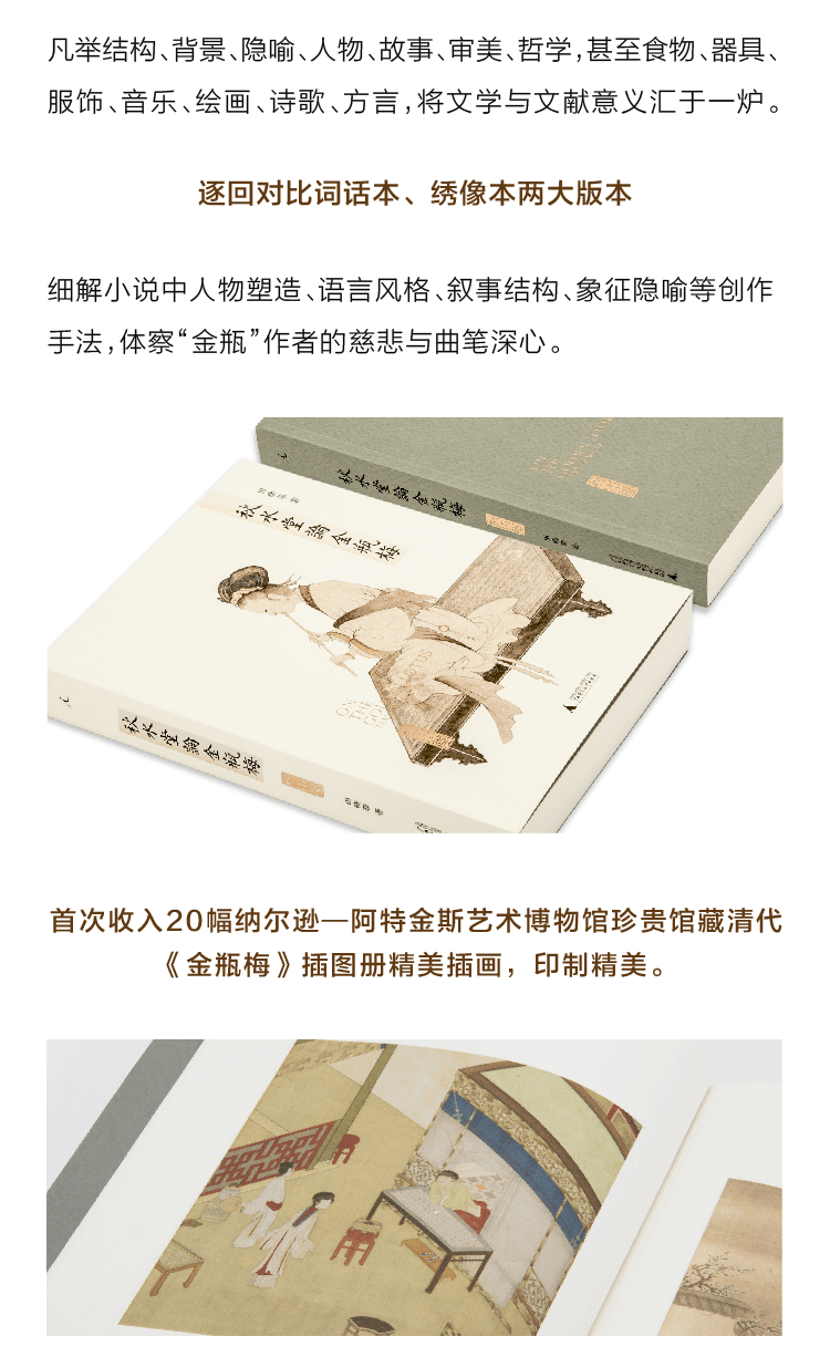 1. 高晓松作序推荐,体验“电影拉片”式阅读——高晓松序言说,本书读解《金瓶梅》之详尽,几乎与学电影时一个个镜头“拉片”相似,凡举结构、背景、隐喻、人物、故事、审美、哲学、食物、器具、服饰、音乐、绘画、诗歌、方言……高晓松用五期《晓说》讲述《金瓶梅》,其中不少想法受秋水堂启发,若对照节目与本书,当能体会其中默契。