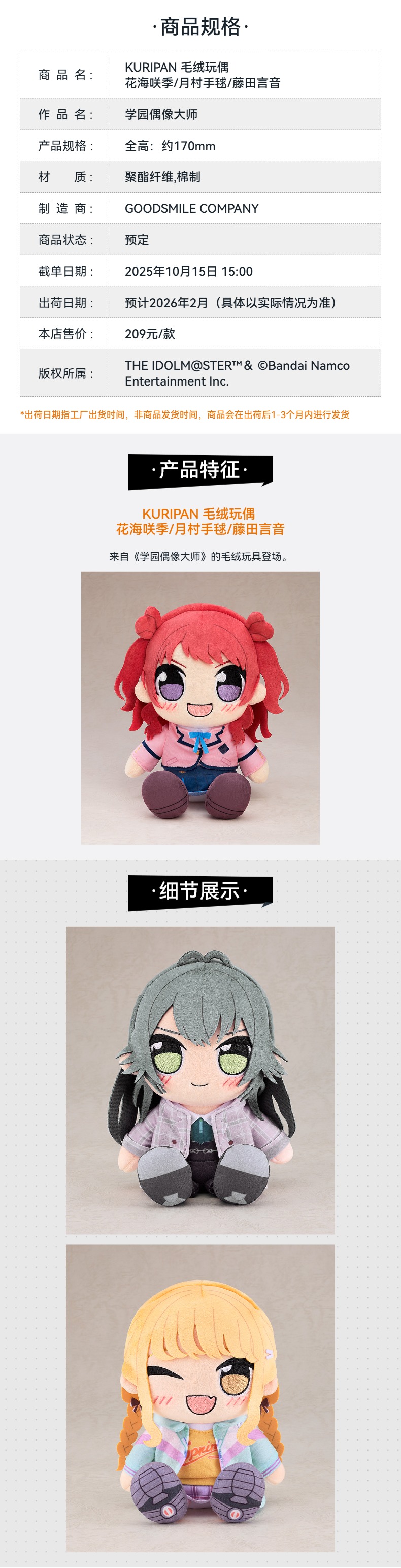 【GSC预售定金】KURIPAN 毛绒玩偶 花海咲季/月村手毬/藤田言音 学园偶像大师