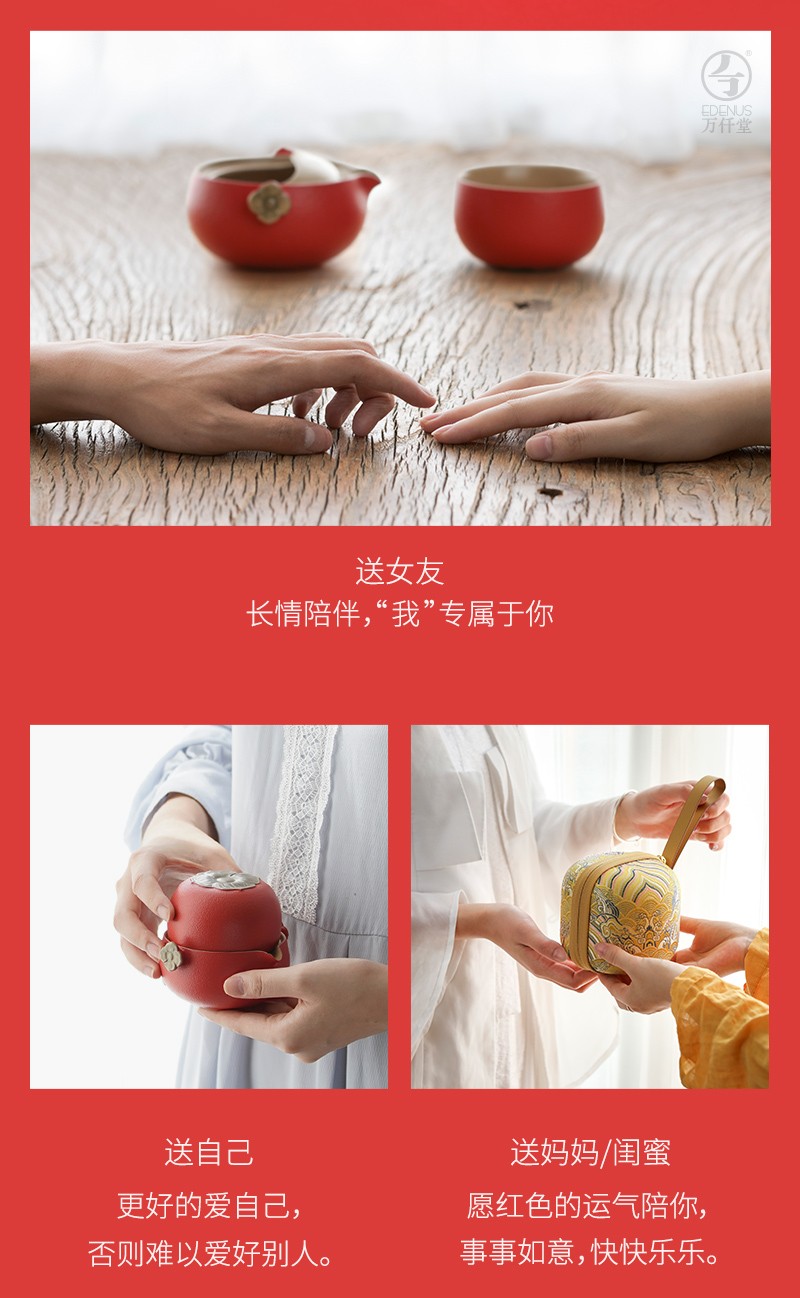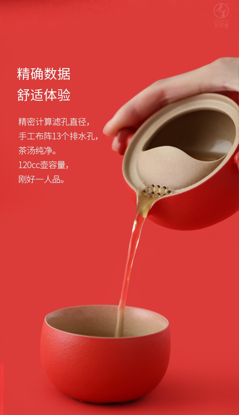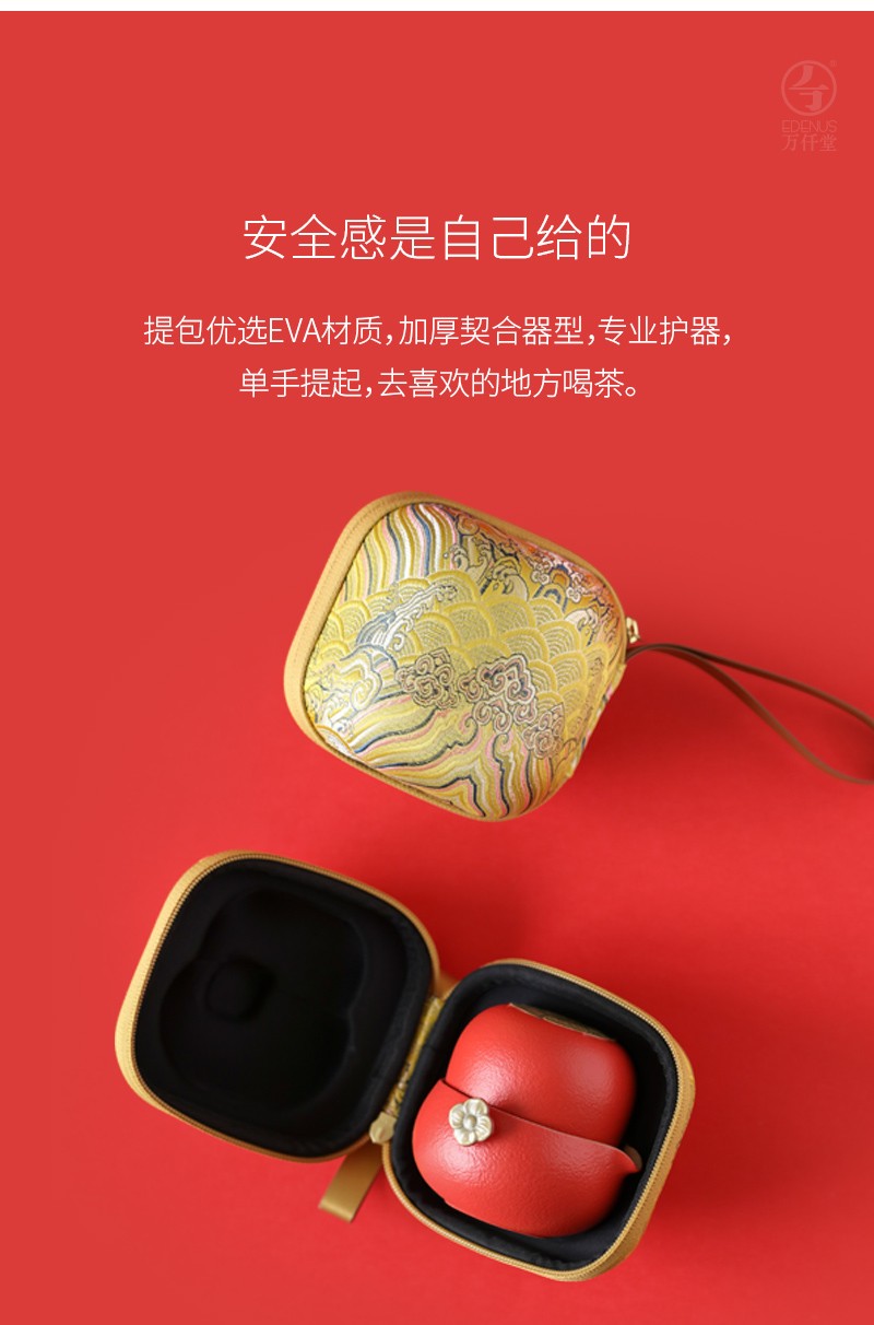 万仟堂(Edenus)旅行茶具 高档快客杯陶瓷套装一壶一杯女性便携包送礼 事事如意A 朱漆釉(升级版)