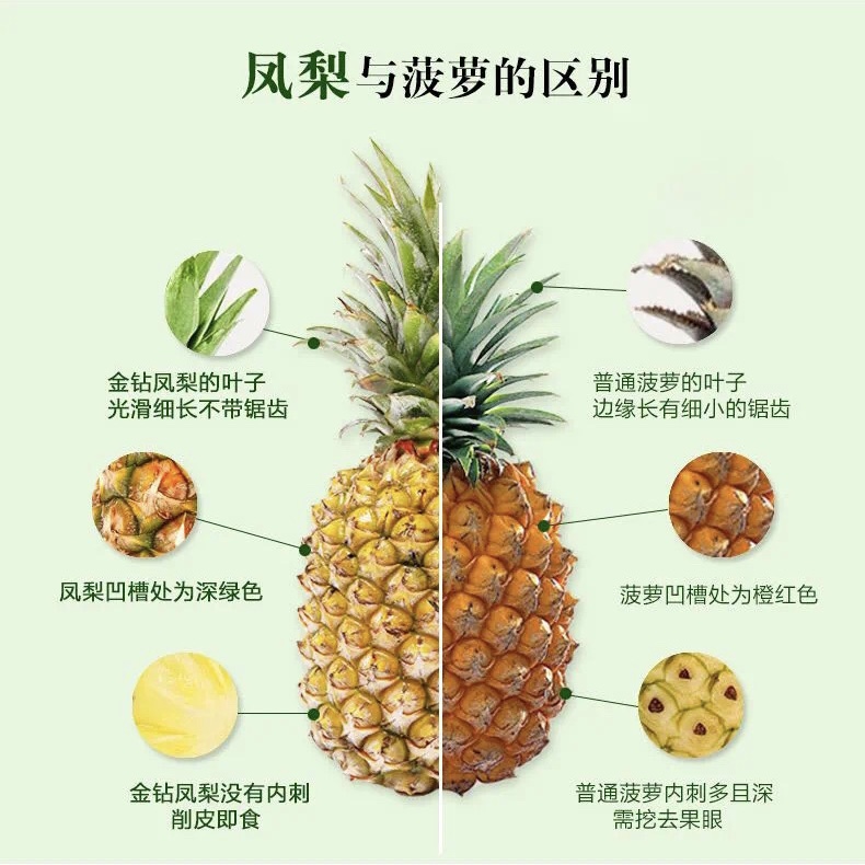 3、凤梨没有内刺削皮即可食用;菠萝内刺多且深,需挖去果眼