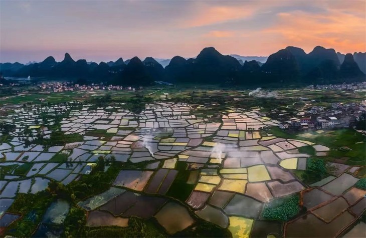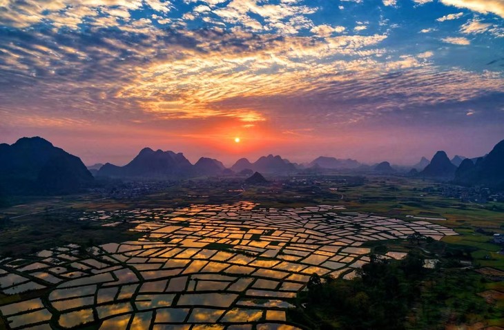 早餐后驱车前往会仙,这里四面环山,阡陌纵横,山鸟虫鱼,阳光尽情地洒在田野之中,从山上俯瞰,犹如一块块晶莹剔透的镜子,山峰映过,彩霞漫天,美不胜收,因而得名玻璃田。适时拍摄田园晚霞。