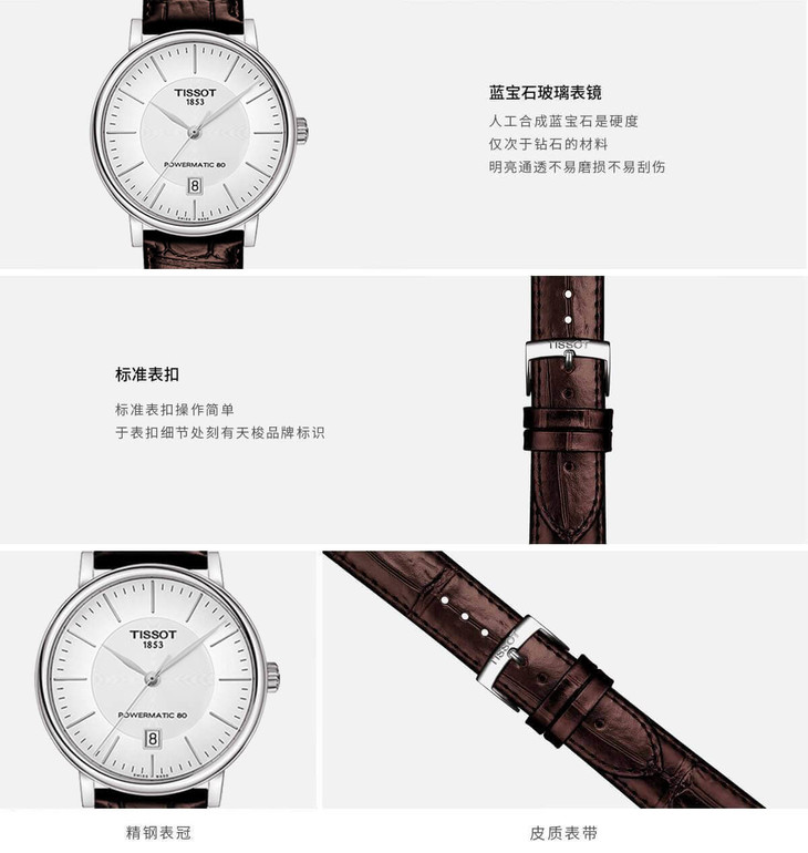 镜面 材质 | 蓝宝石水晶玻璃 | 表盘 | 精钢表壳 银色表盘 大三针 日期显示 条字刻度时标 |