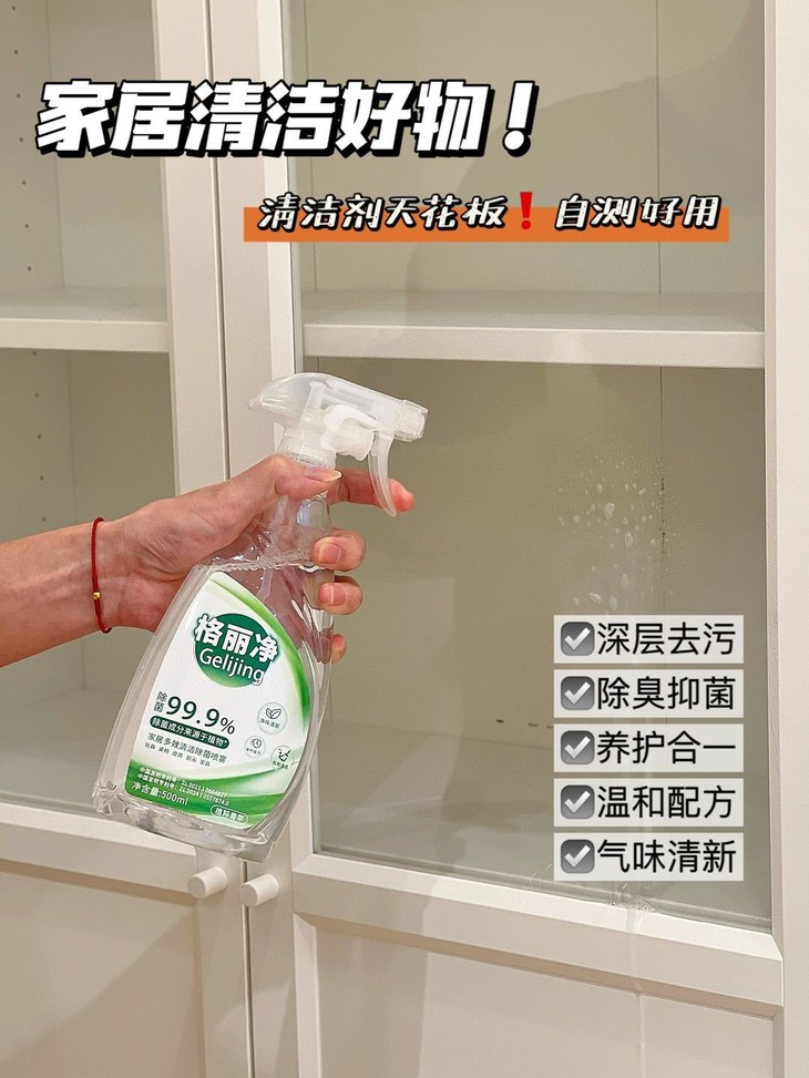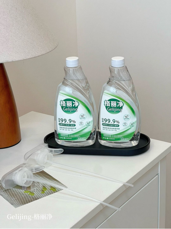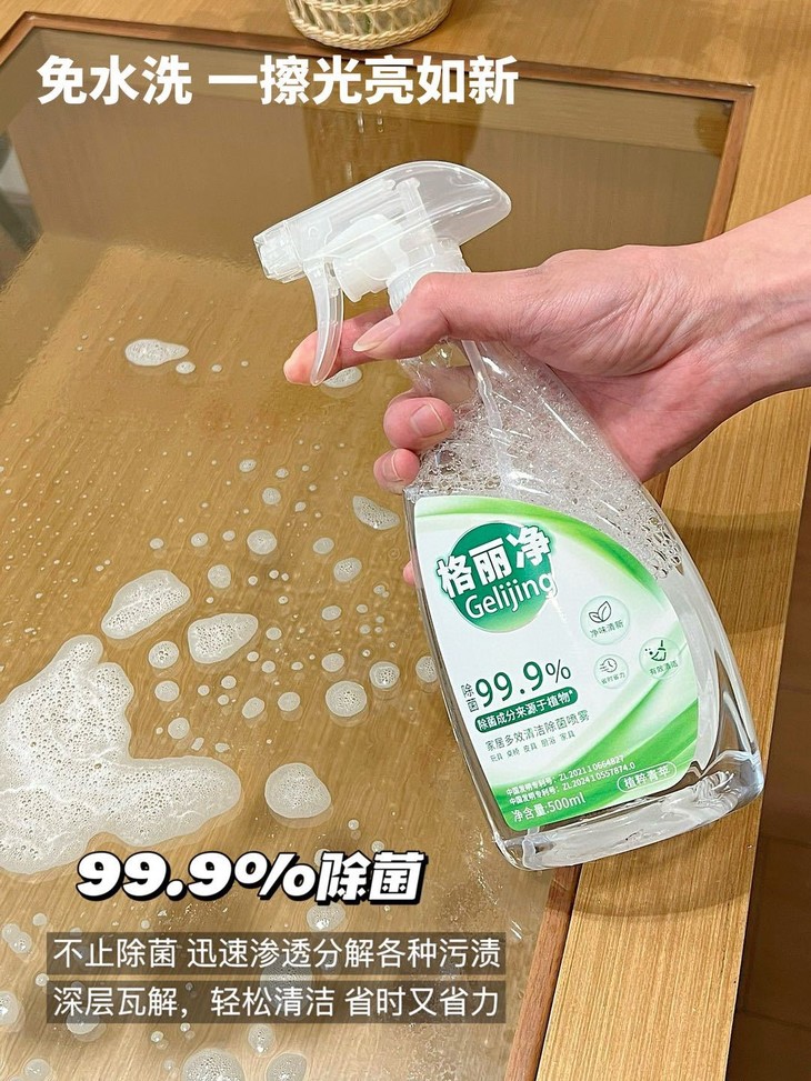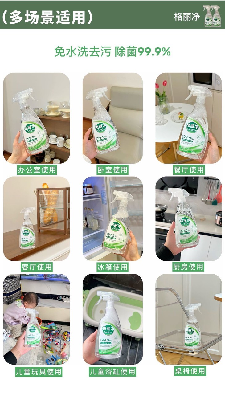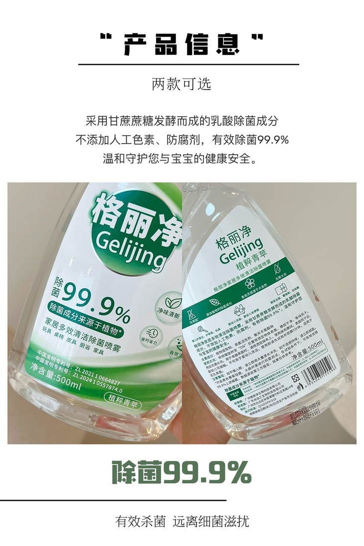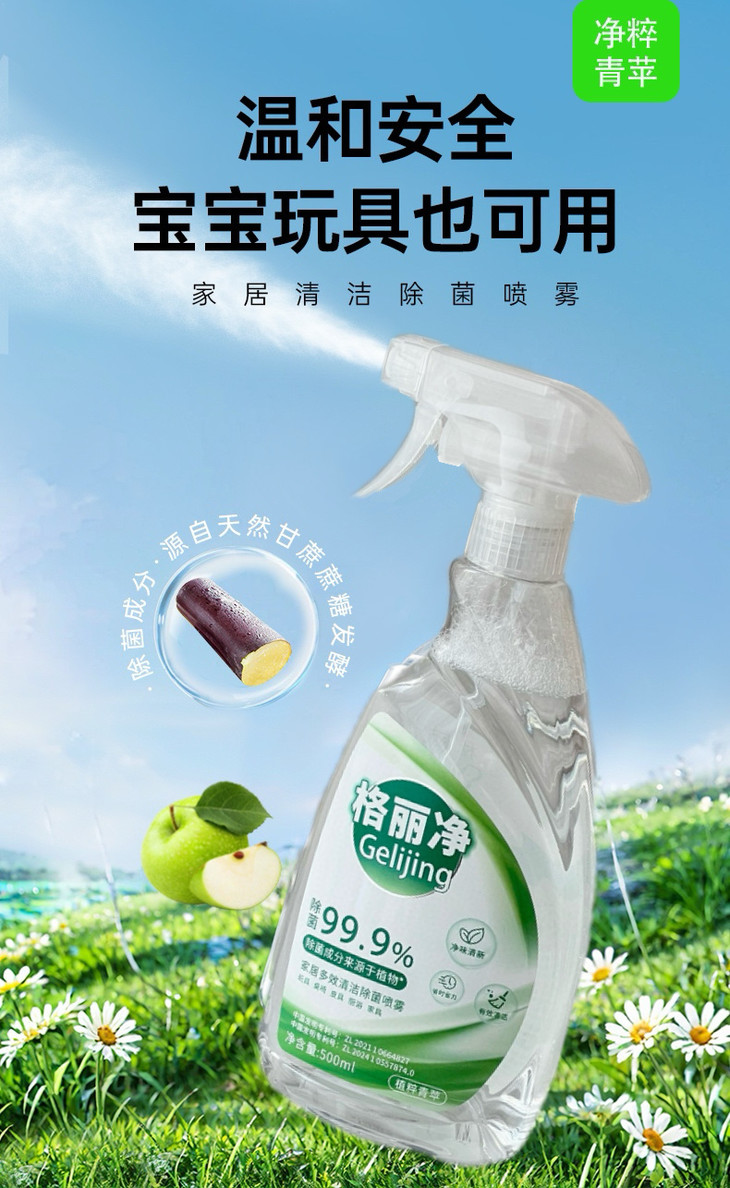 格丽净家居多效清洁除菌喷雾 采用甘蔗蔗糖发酵而成的乳酸除菌成分 不添加人工色素、防腐剂,有效除菌99.9%” 温和守护您与宝宝的健康安全。