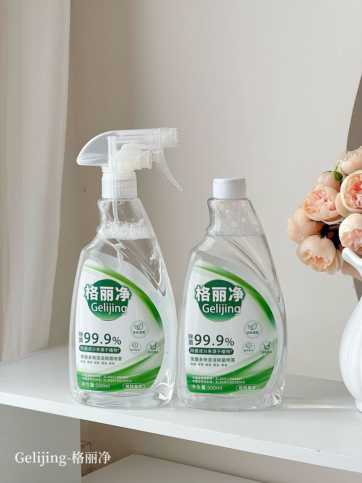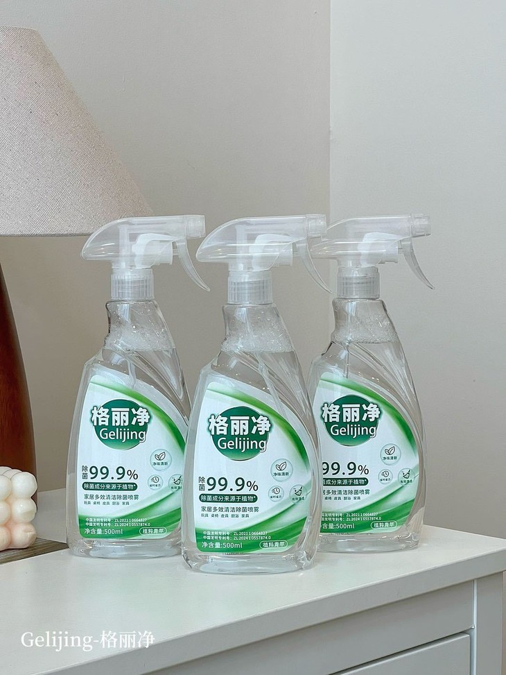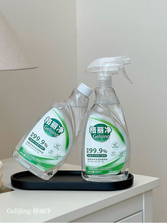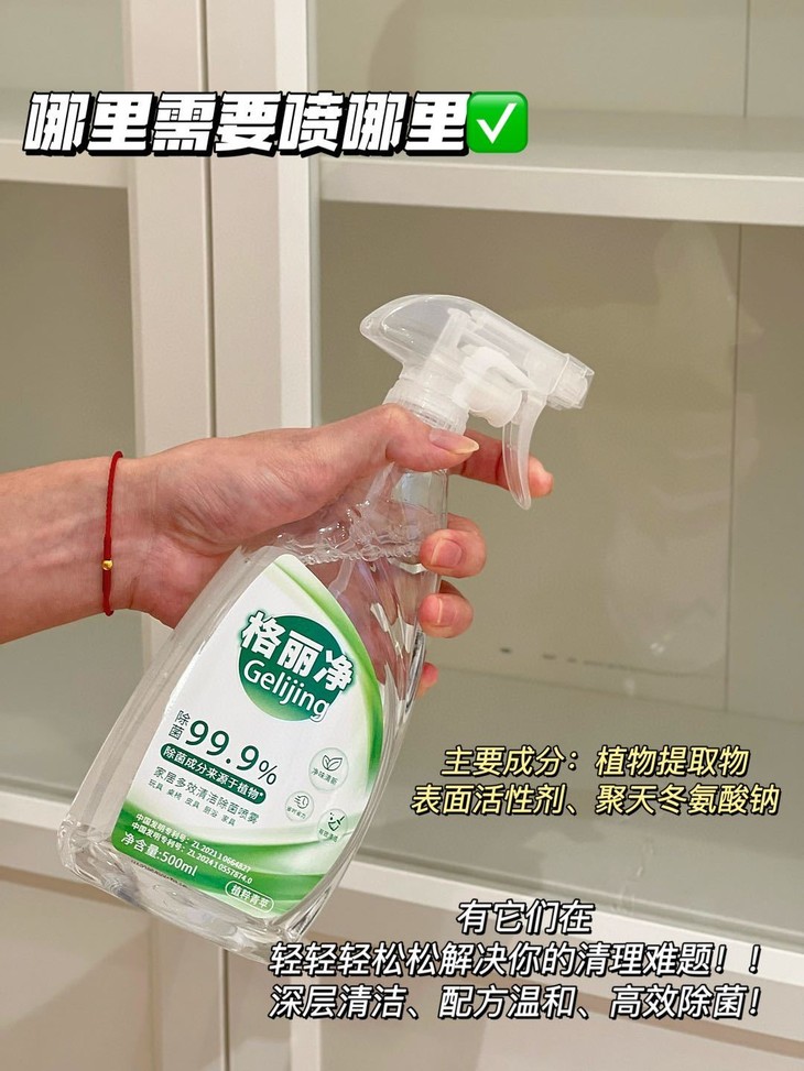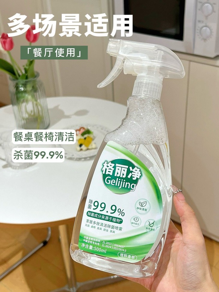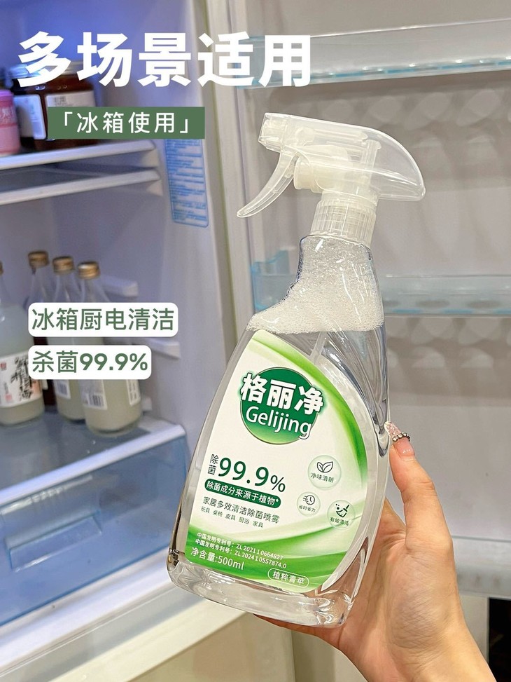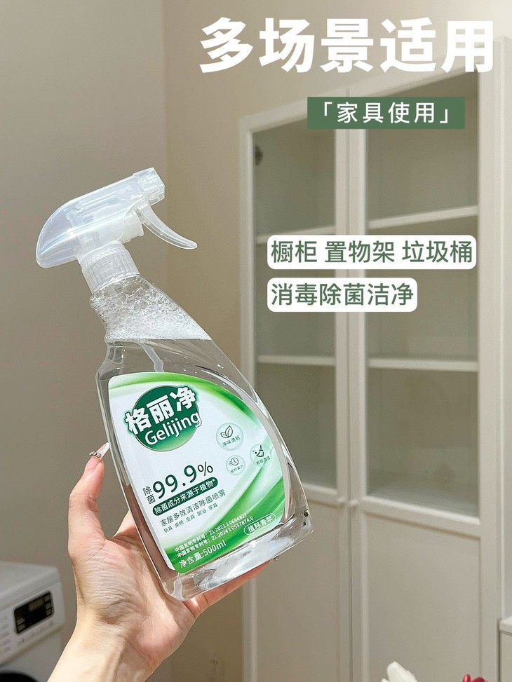 格丽净家居多效清洁除菌喷雾 采用甘蔗蔗糖发酵而成的乳酸除菌成分 不添加人工色素、防腐剂,有效除菌99.9%” 温和守护您与宝宝的健康安全。
