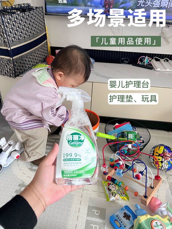 母婴级家居清洁除菌喷雾,给宝宝更安心的保护! 它采用天然甘蔗蔗糖发酵而成的乳酸杀菌配方 可有效杀菌99.9%*,一按即喷 能帮助妈妈一次性搞定玩具的除菌和去污难题。