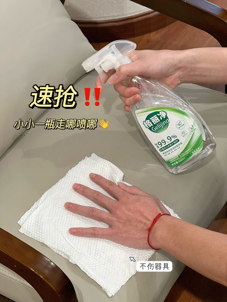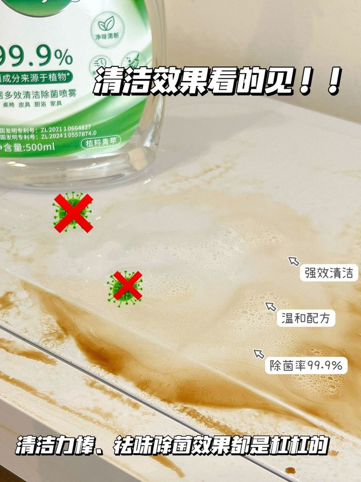 地板、茶几、桌椅等等常见污渍 这款清洁喷雾也可助你一臂之力~ 擦完很干净还不会残留泡沫痕迹 即喷即擦,随时随地守护家人健康。 集清洁、养护、除菌与一体! 去污成分都是植物萃取,非常安全! 家里有孕妇、小孩子、宠物都能用~