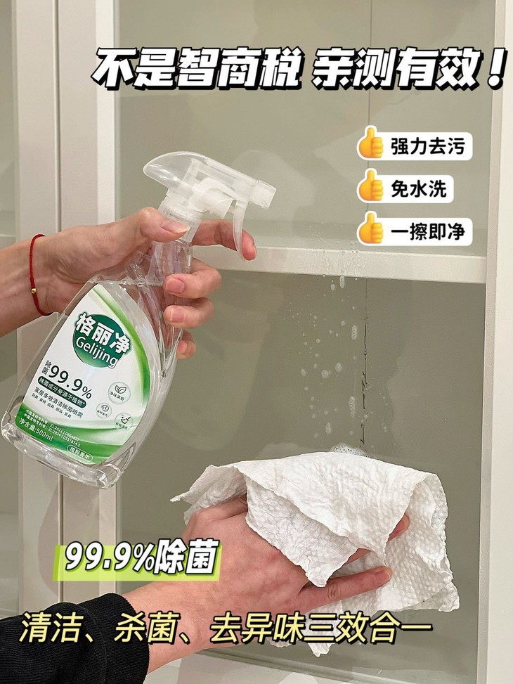 这款多功能喷雾无需兑水 对厨房常见污渍: 灶台脏痕、墙壁油污、冰箱污垢等等, 它就像“魔法师”一样 直接喷在需要清洁的地方 直接用抹布擦就可以了 不用再洗抹布做二次清洁。