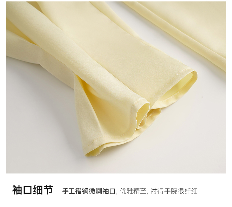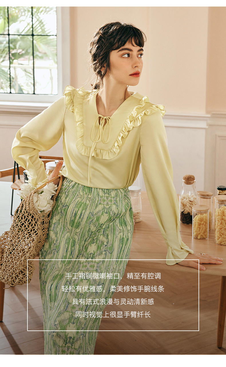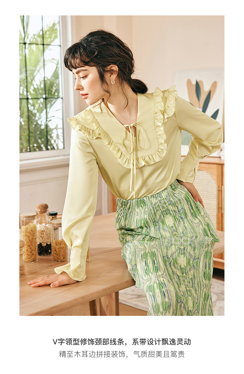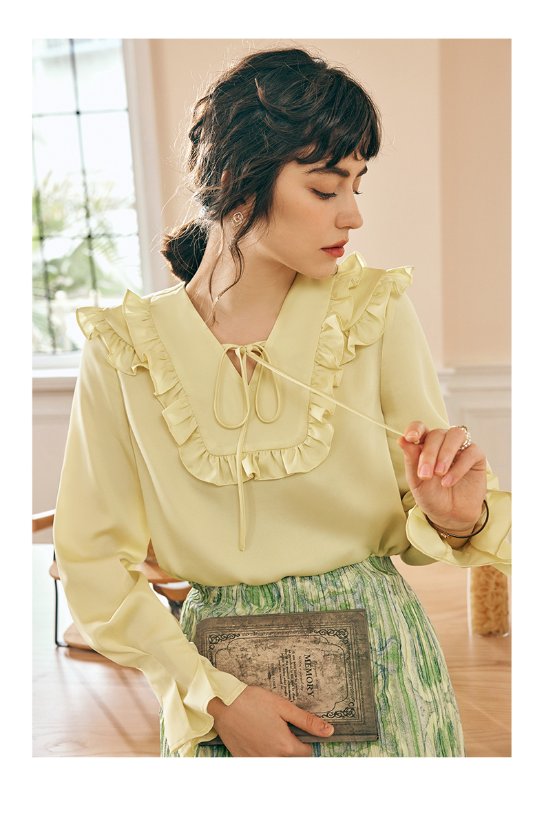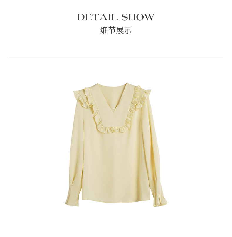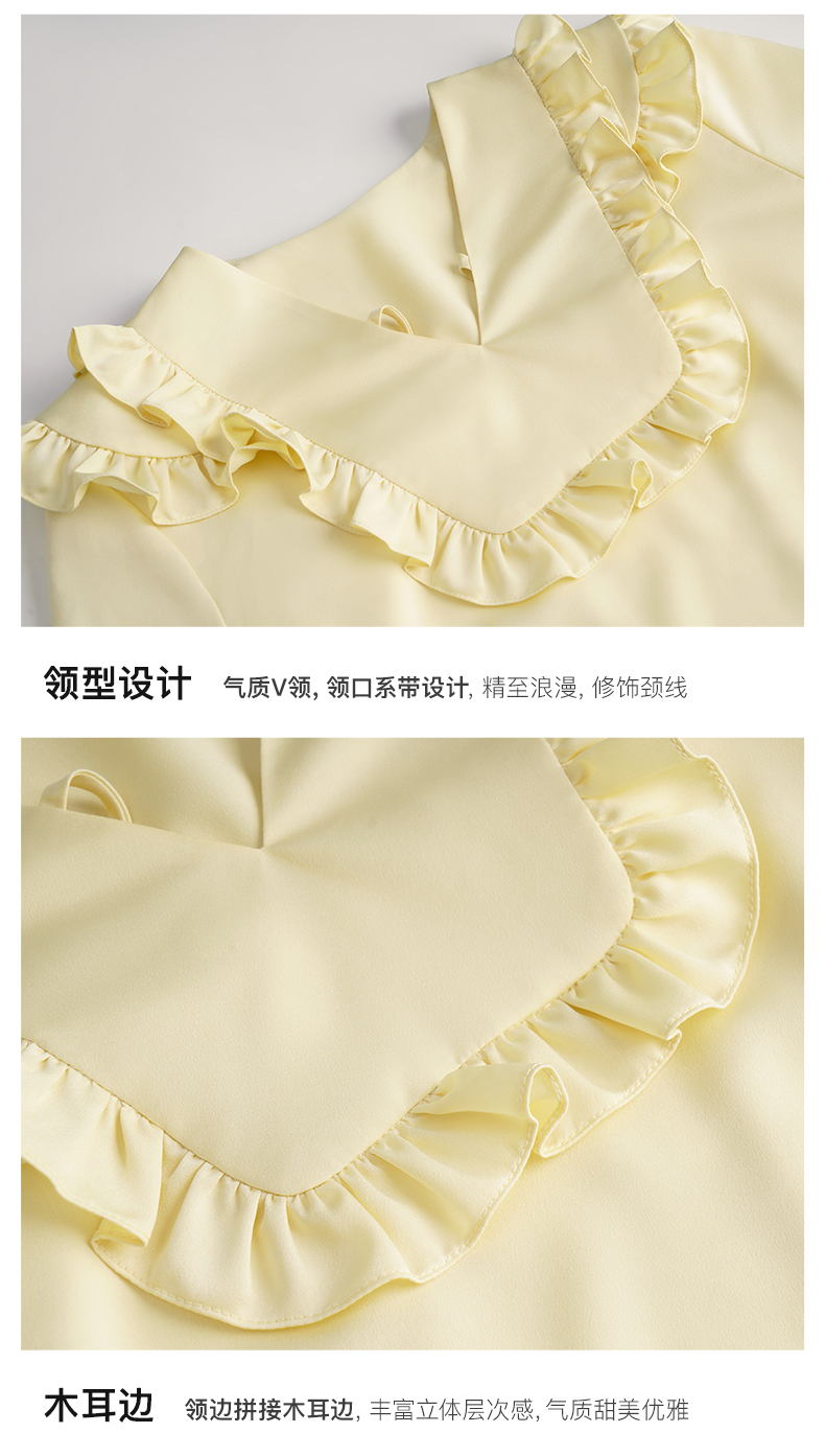 OLrain欧芮儿法式黄色雪纺蕾丝衫女春季2023年新款荷叶边缎面小衫