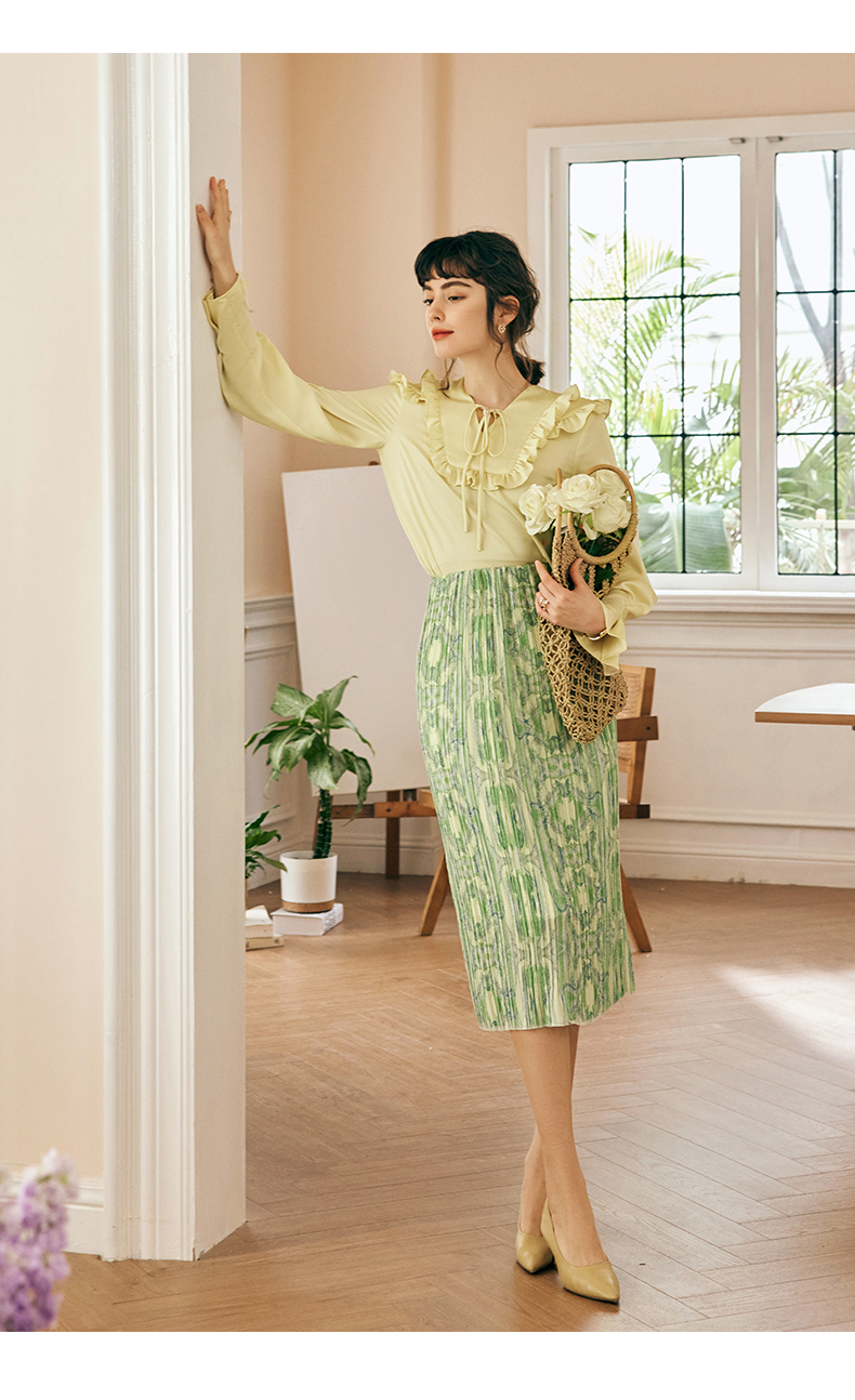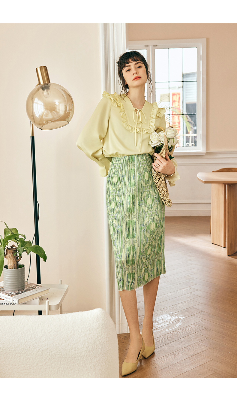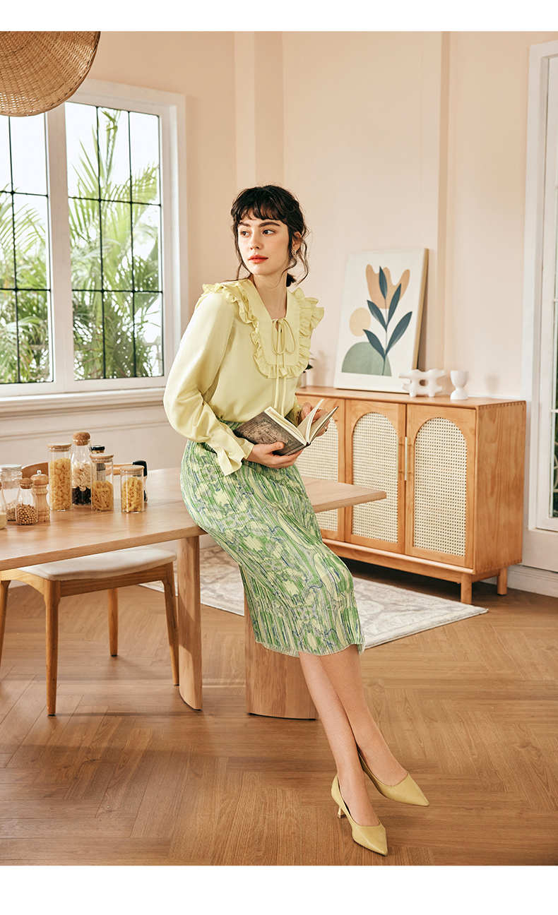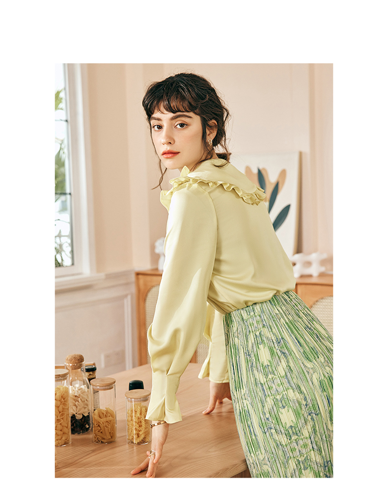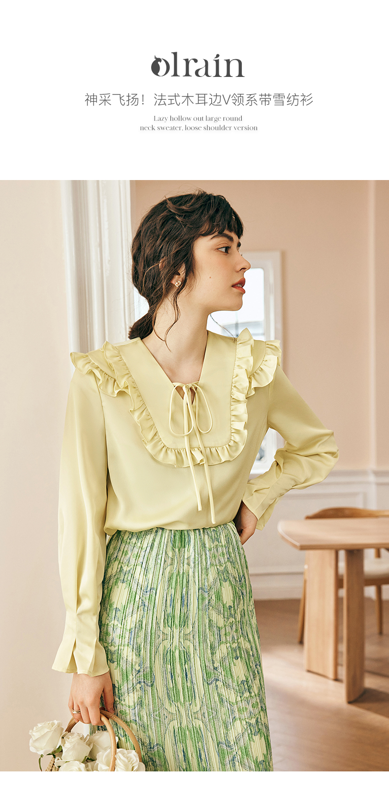 OLrain欧芮儿法式黄色雪纺蕾丝衫女春季2023年新款荷叶边缎面小衫