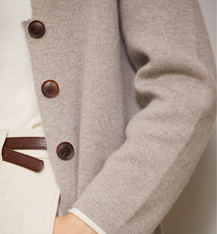 领部特别设计的小V开领,轻描淡写间,却透露出一股英气。搭配精致的滚边包边,天然色的玳瑁钮扣,各个细节都能彰显你的精致细腻。