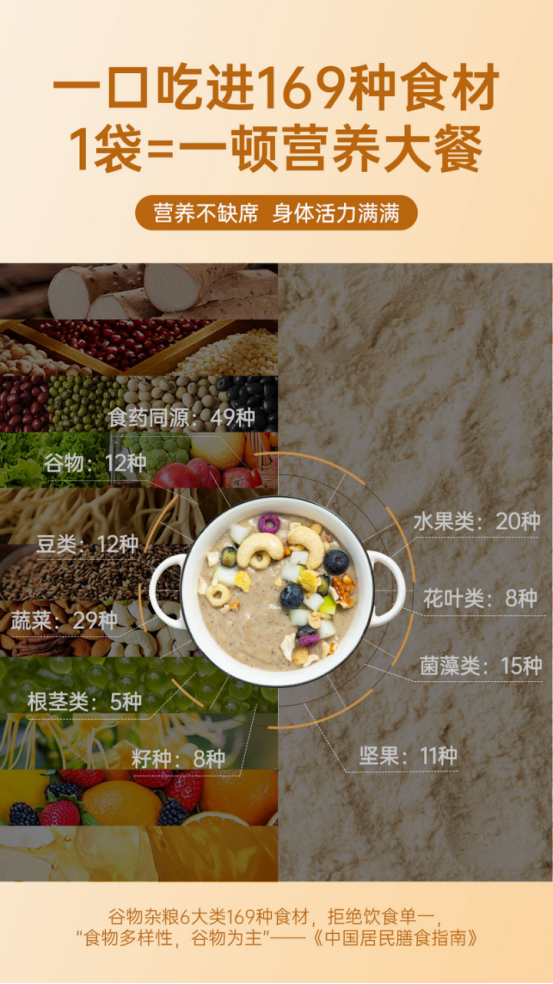 169谷物全素餐💥一条代一餐‼‼ 只控制热量,不减营养❗ 营养丰富🟤169种自然优质食材 代餐饱腹🟤摄入的是优质碳水 续航能量🟤每条补充足够蛋白质 满足饱腹感,同时多种营养超硬核补给,更健康!