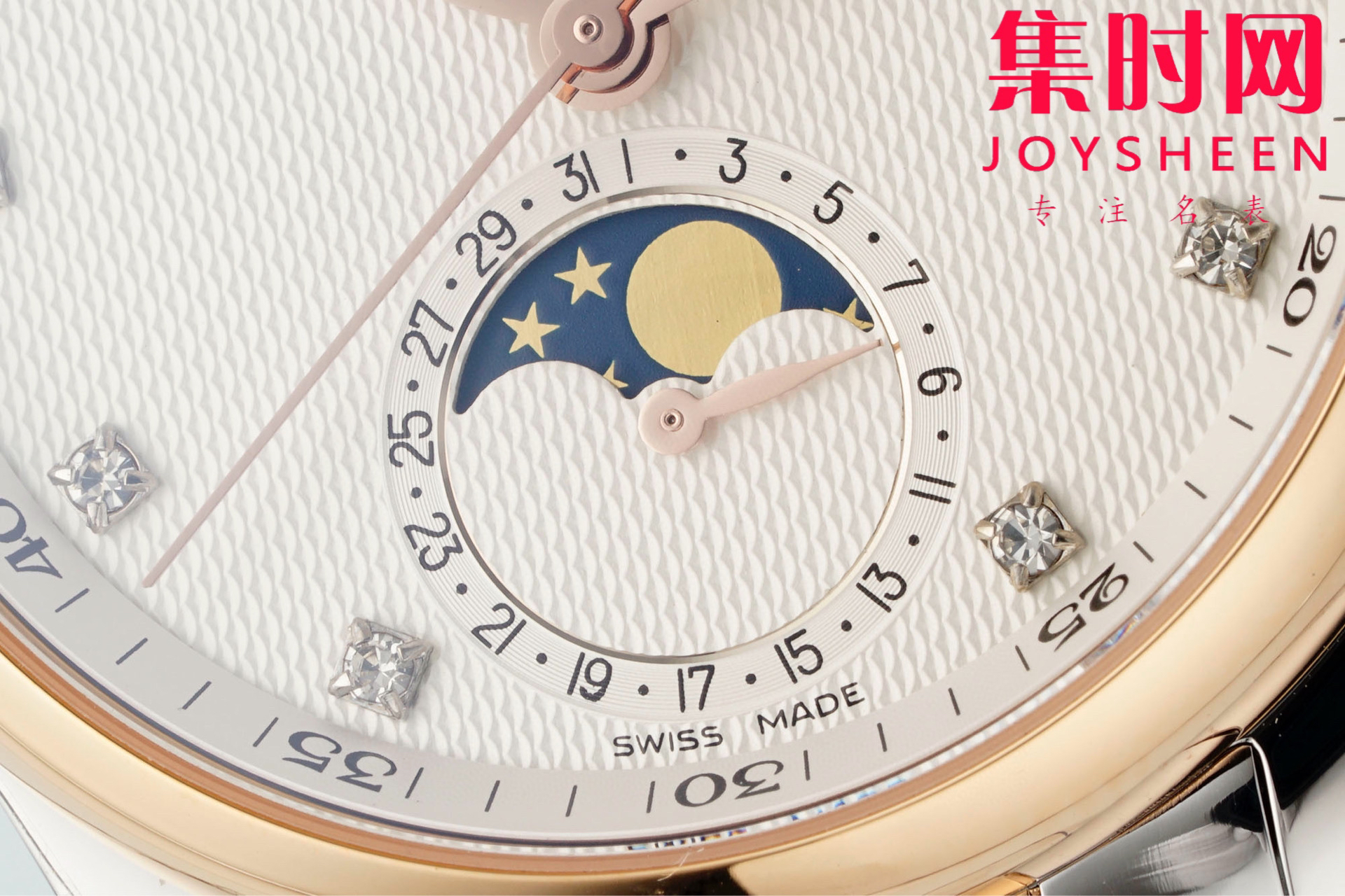盘面匠心设计,搭配阿拉伯数字时标或钻石时标更是彰显奢华品味。6点钟位置巧妙地融入了日期显示环与月相显示窗口,使得佩戴者在欣赏月相变化的同时,也能便捷地获取当前日期信息。而银色麦粒纹饰的点缀,是对名匠腕表经典元素的完mei传承。尤其是那优美的柳叶指针,更是巧妙地衬托出整体设计的和谐与美感。