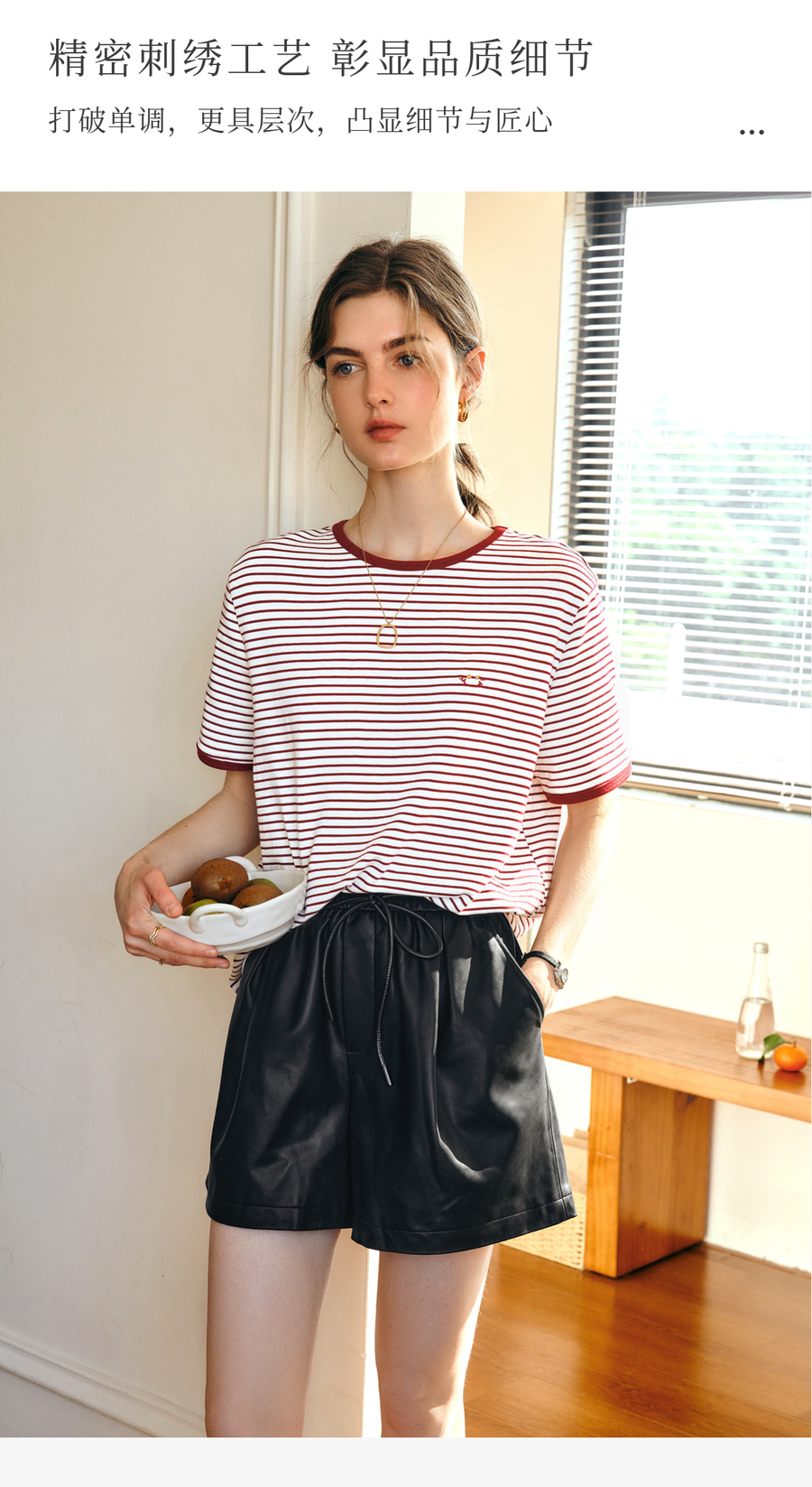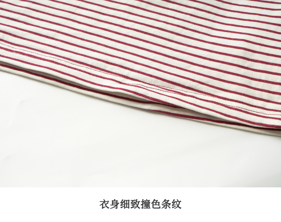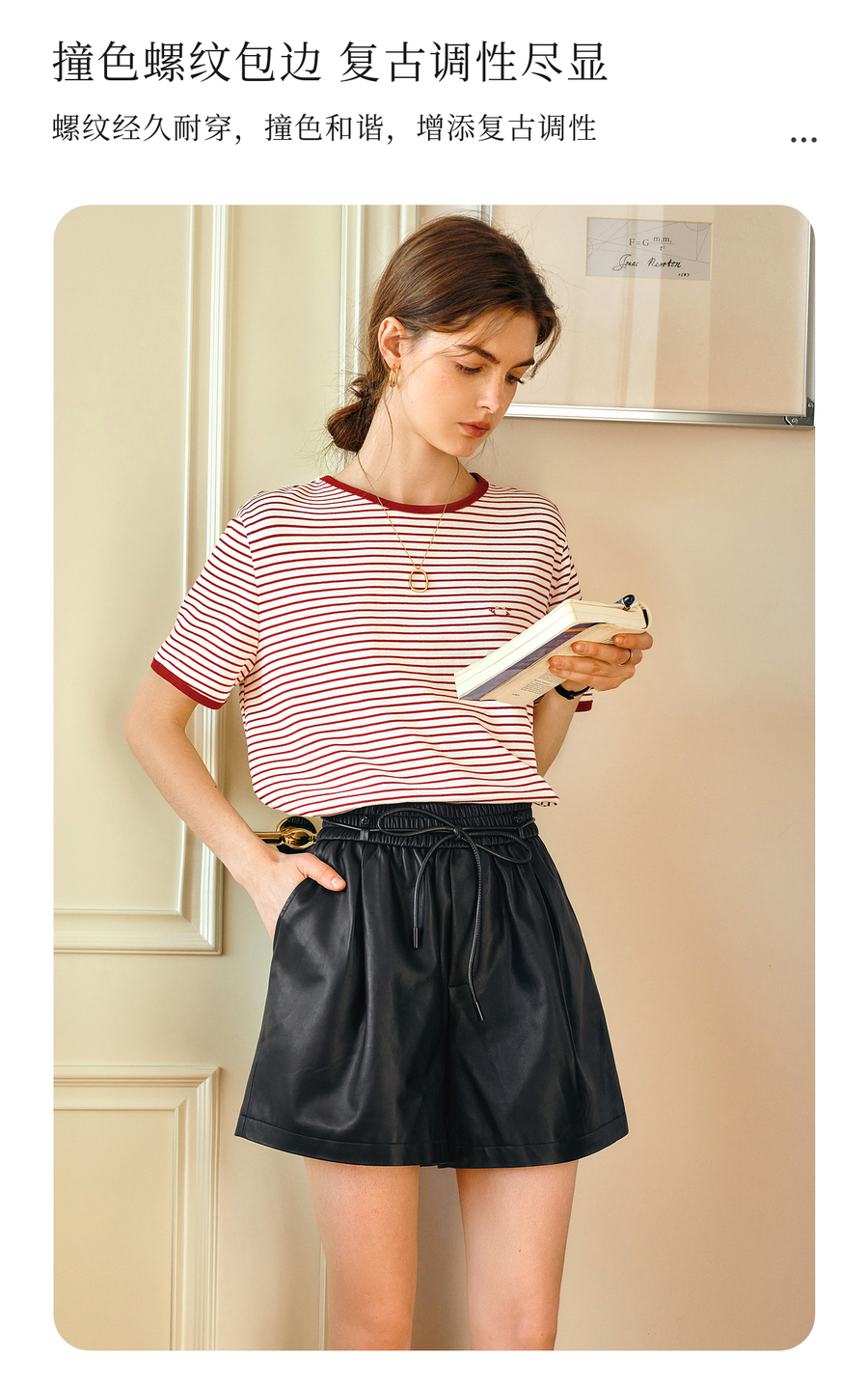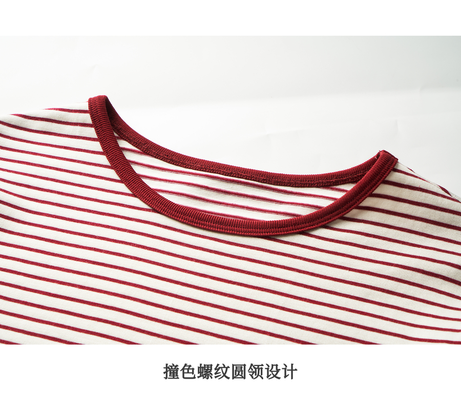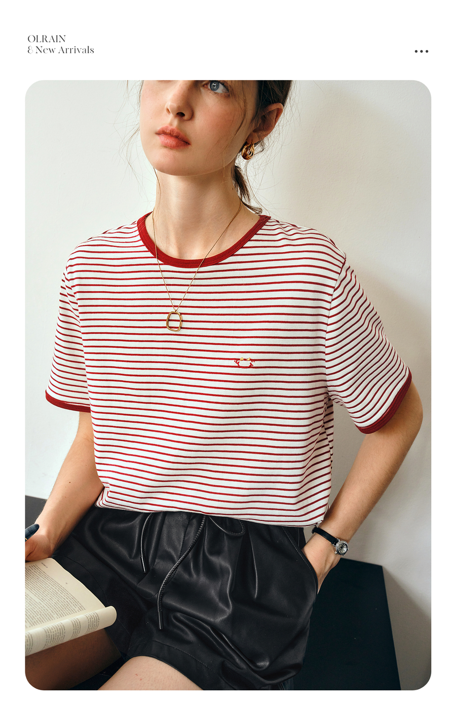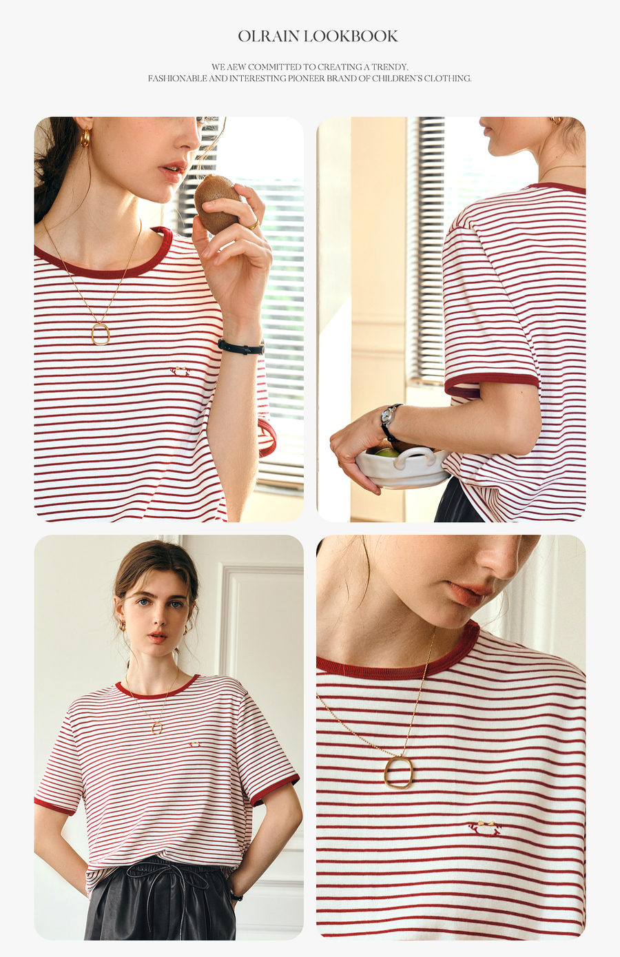 OLrain欧芮儿复古红色条纹撞色短袖T恤女春季2025年新款休闲上衣