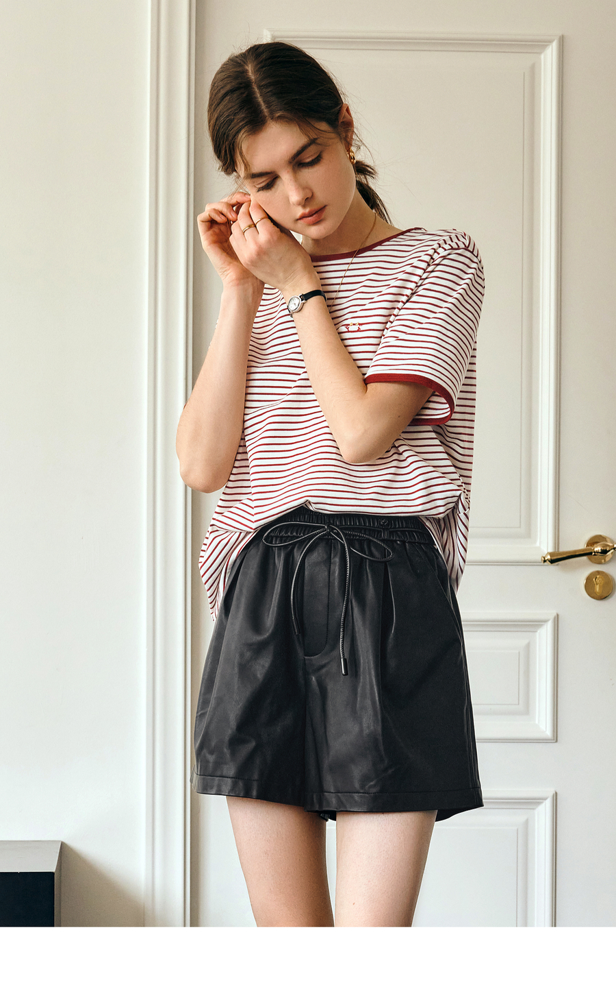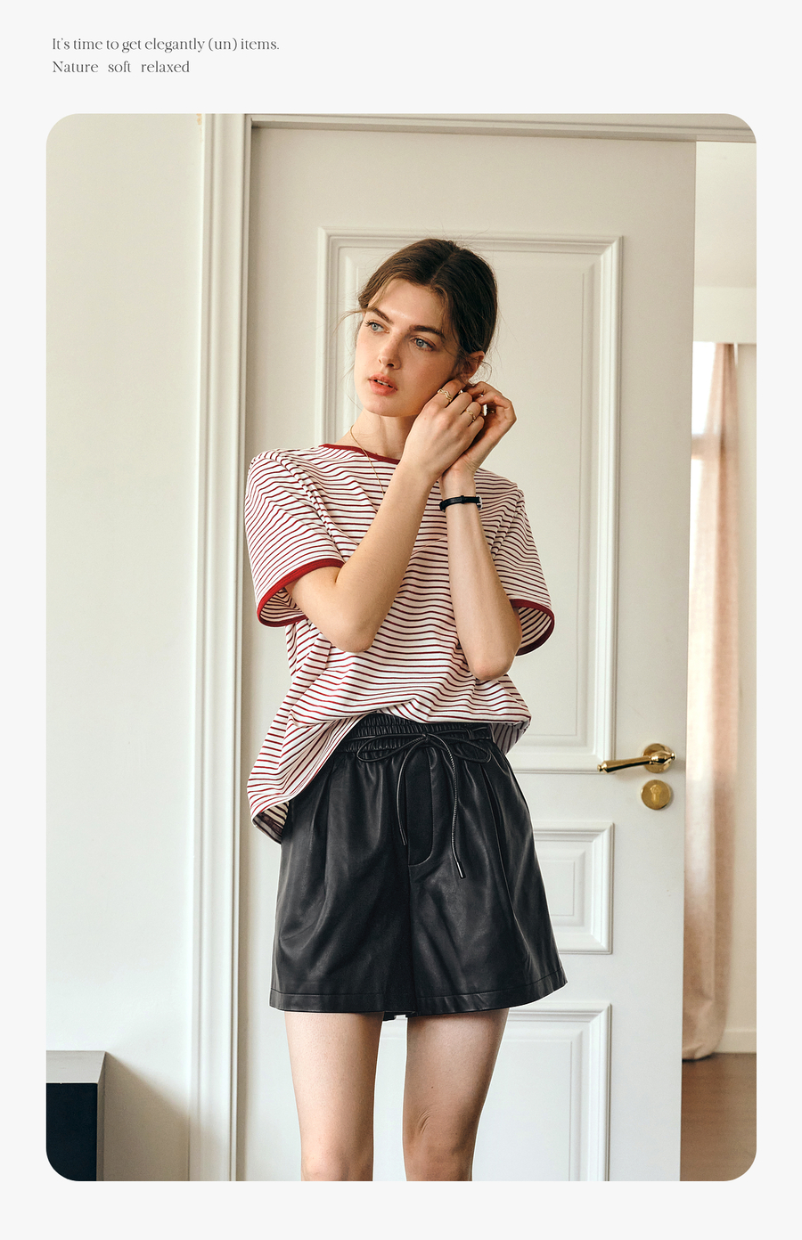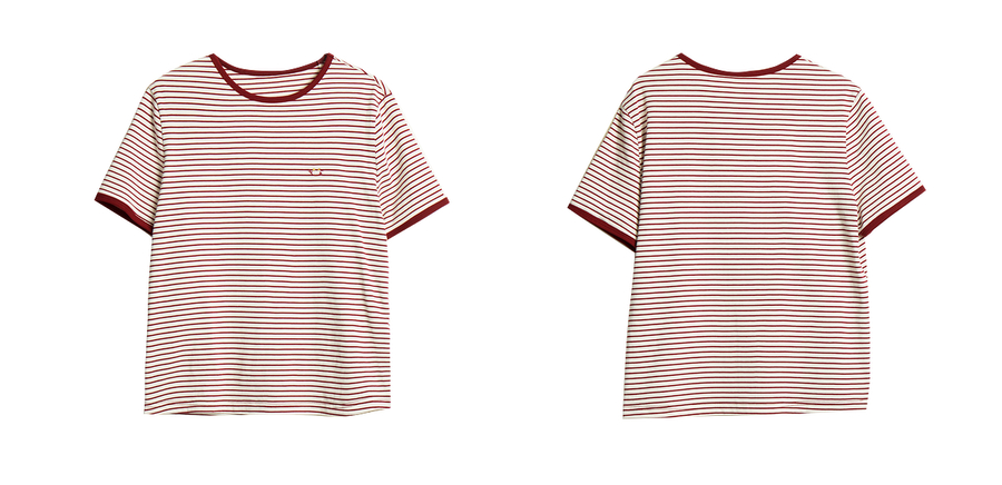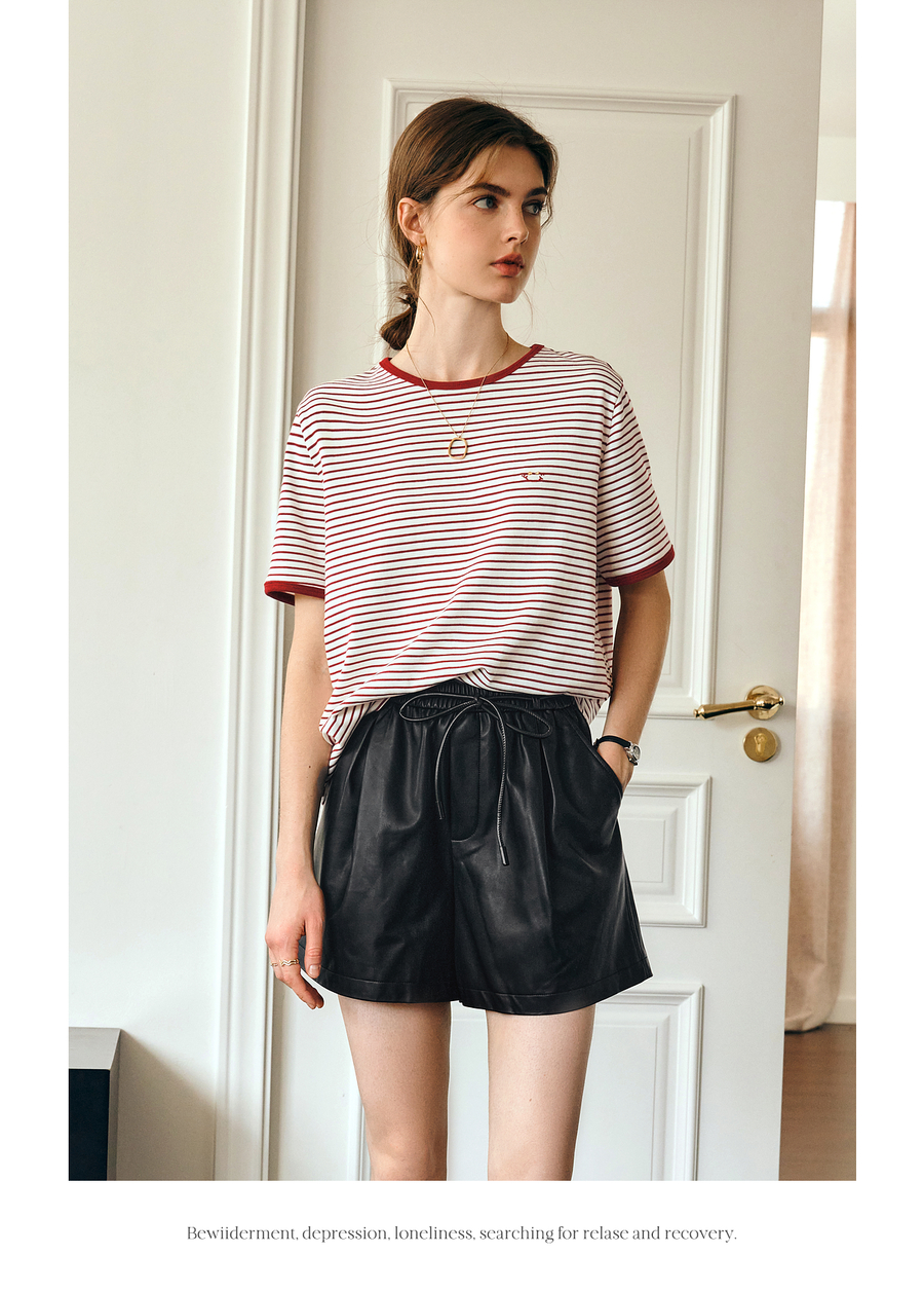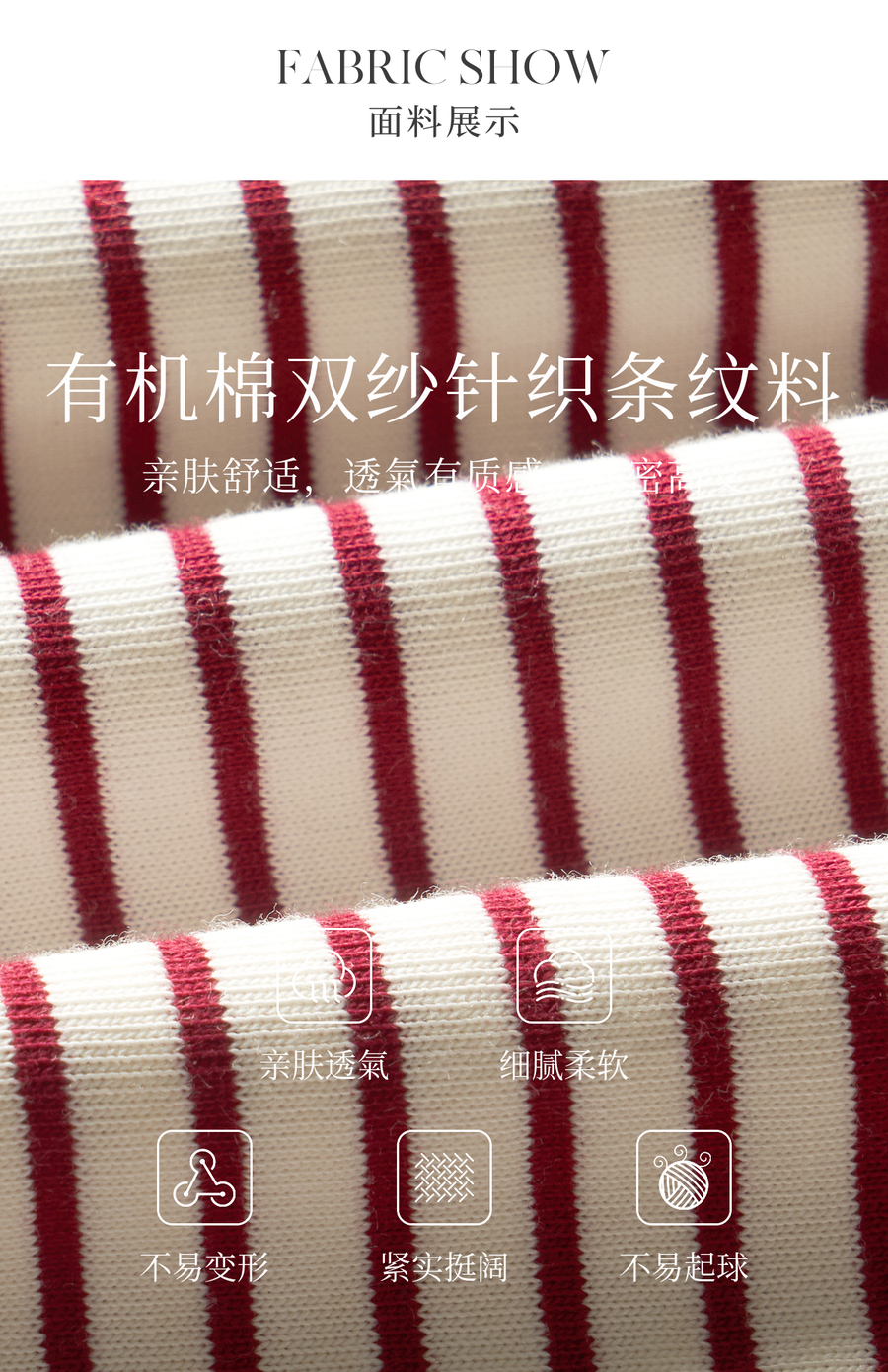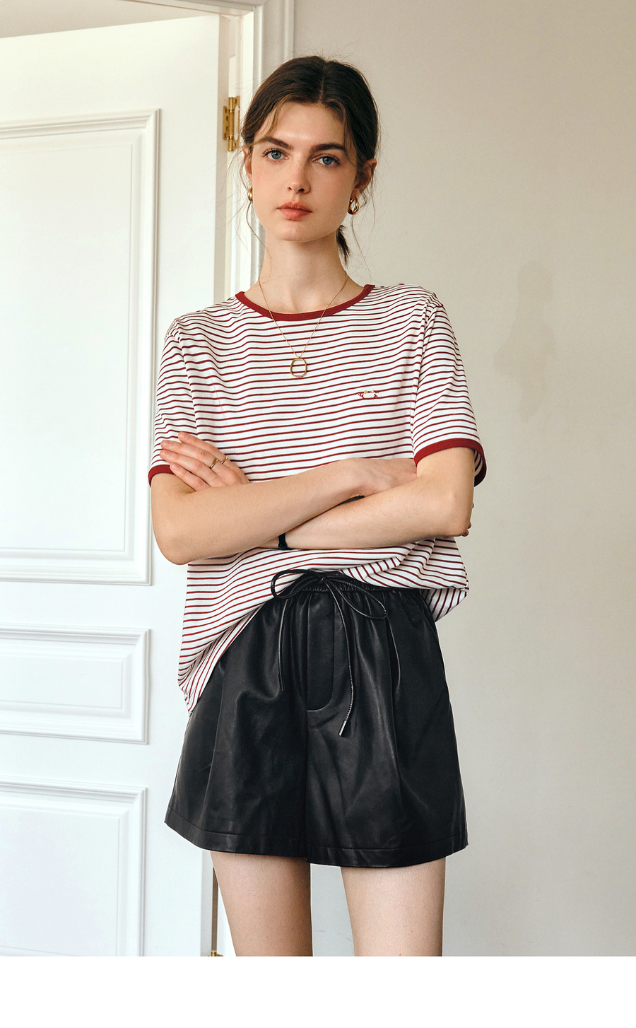 OLrain欧芮儿复古红色条纹撞色短袖T恤女春季2025年新款休闲上衣