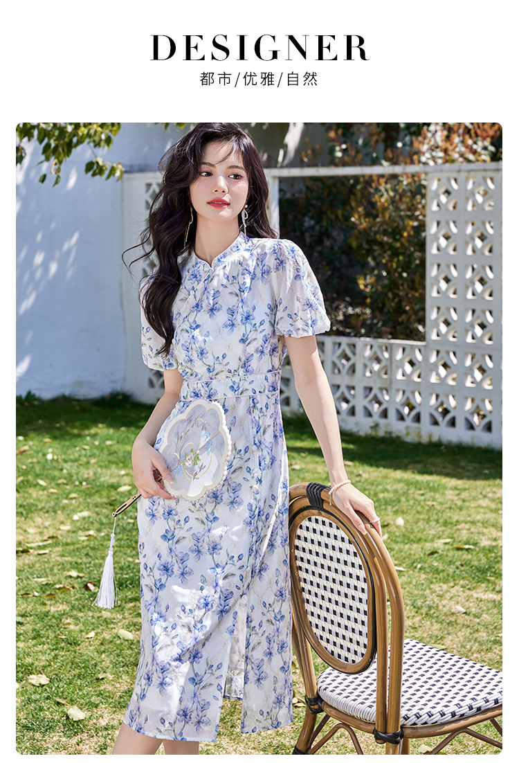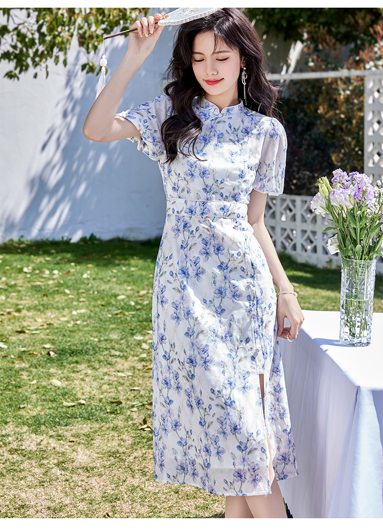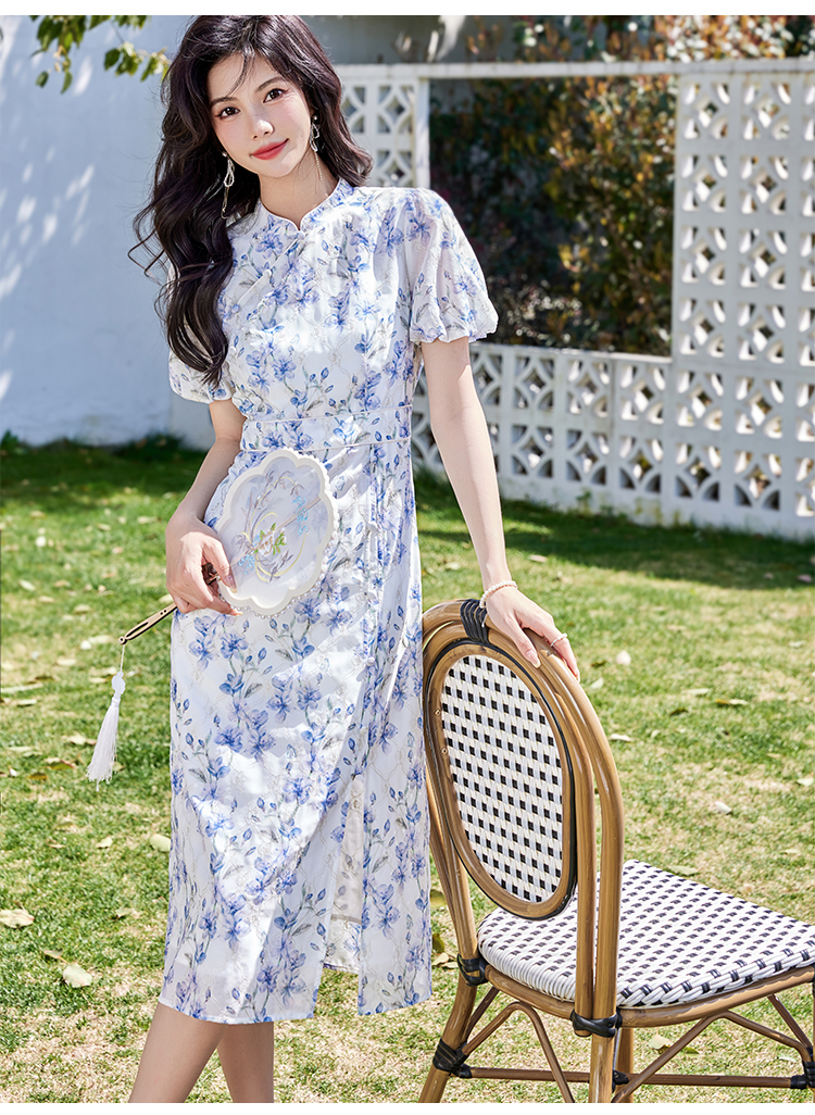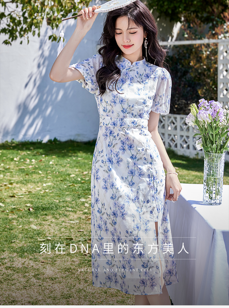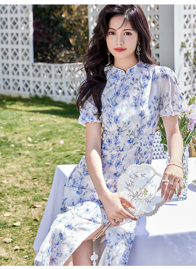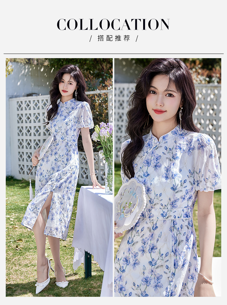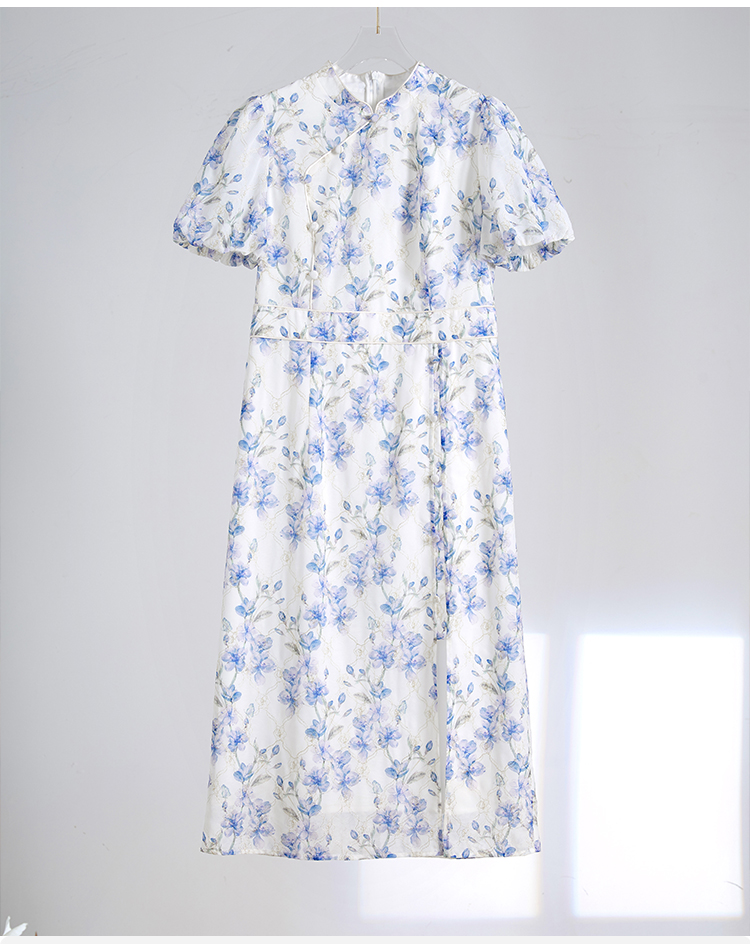 【专属特价】熙世界青花瓷印花国风立领改良版新中式泡泡袖开叉旗袍连衣裙女夏