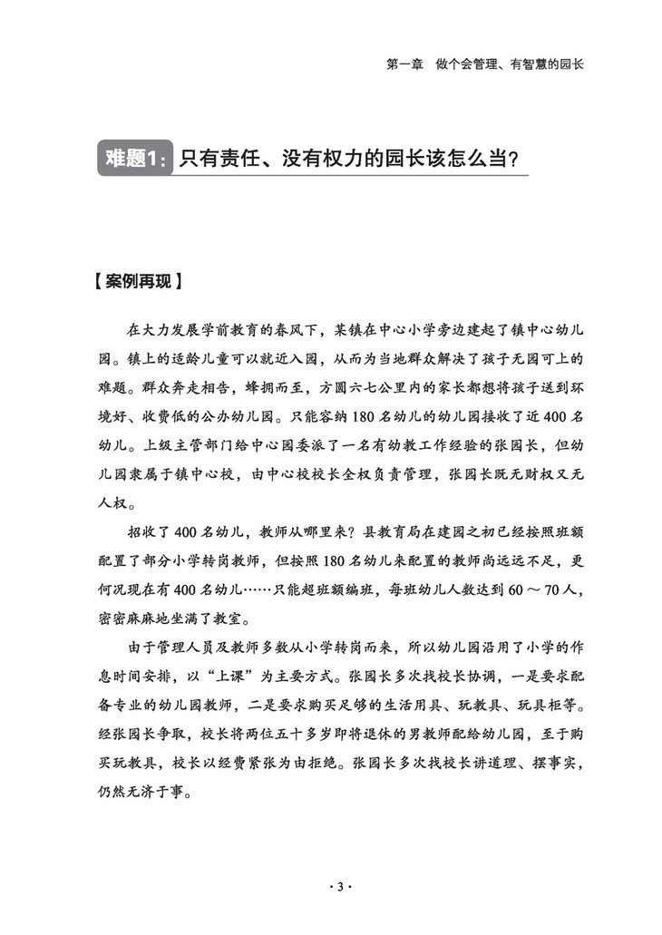 在书中,作者针对每个难题,都从“案例再现”“案例分析”“解决策略”“温馨提示”四个方面进行展开,将读者引入真实生动的现场,引导读者剖析难题产生的原因,感受优秀园长破解难题的智慧与经验,并进一步总结反思同类难题的解决之道。