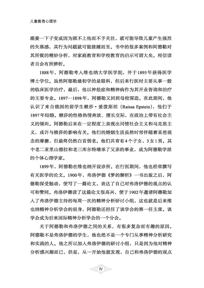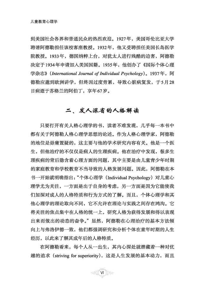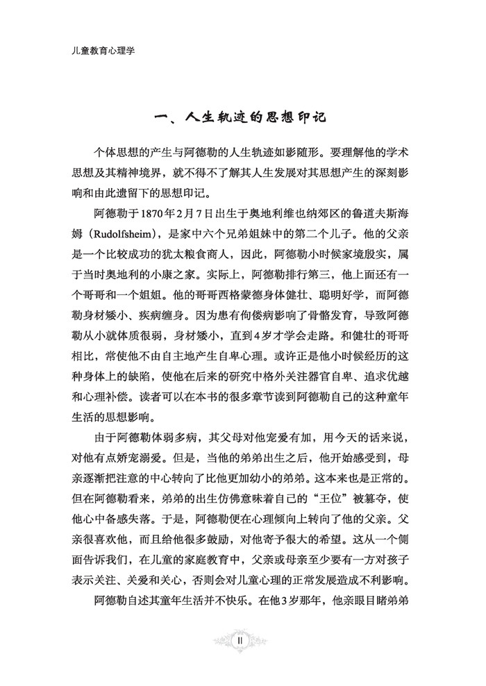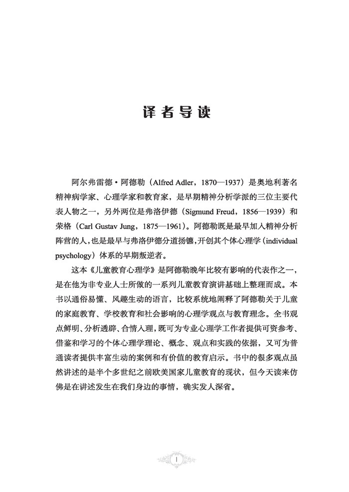 阿尔弗雷德·阿德勒(Alfred Adler,1870—1937),奥地利著名精神病学家,心理学家和教育家,早期精神分析学派的三位主要代表人物之一。他是个体心理学的创始人、人本主义心理学的先驱、现代自我心理学之父,曾创办《国际个体心理学杂志》。阿德勒的学说以“自卑感”为中心,提出的主要概念有:追求卓越、心理补偿、社会兴趣、生活风格等。他一生著述无数,尤其偏重儿童心理学。《儿童教育心理学》是阿德勒晚年比较有影响的代表作之一,也是研究儿童心理的宝典,对如何培养儿童健康的人格具有指导意义。其他主要著作有:《器官自卑及其心理补偿的研究》《神经症人格》《理解人性》《个体心理学的理论与实践》《生活的科学》《自卑与超越》等。这些著作对学校教育和家庭教育都具有重大的思想启示意义,深受社会广泛欢迎。