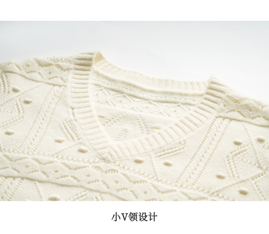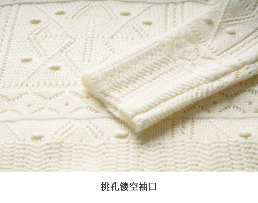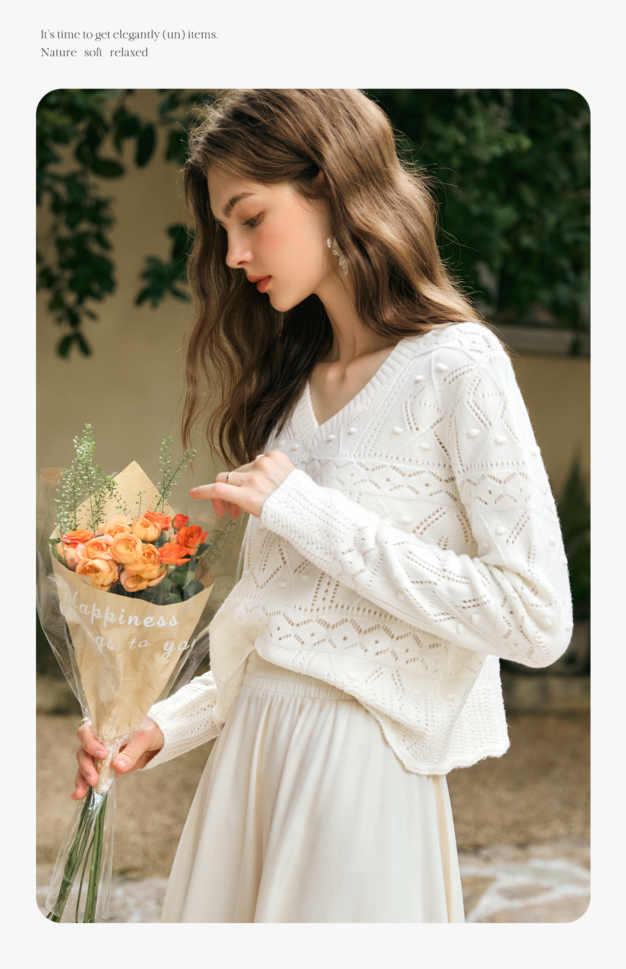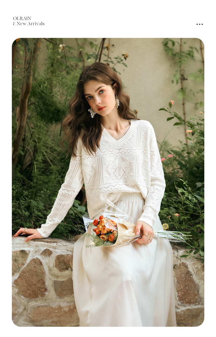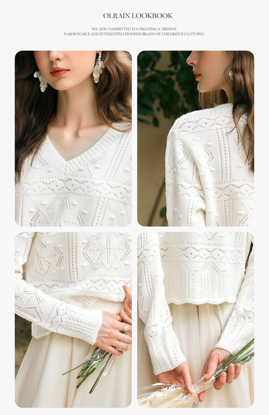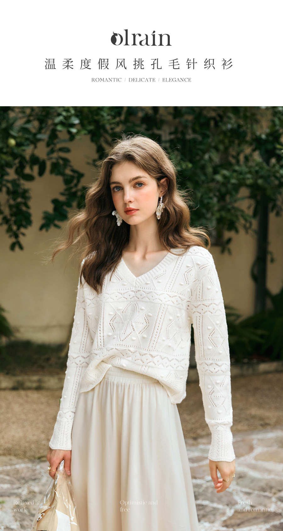 OLrain欧芮儿杏白色针织衫女冬季2024年新款度假风小V领挑孔上衣