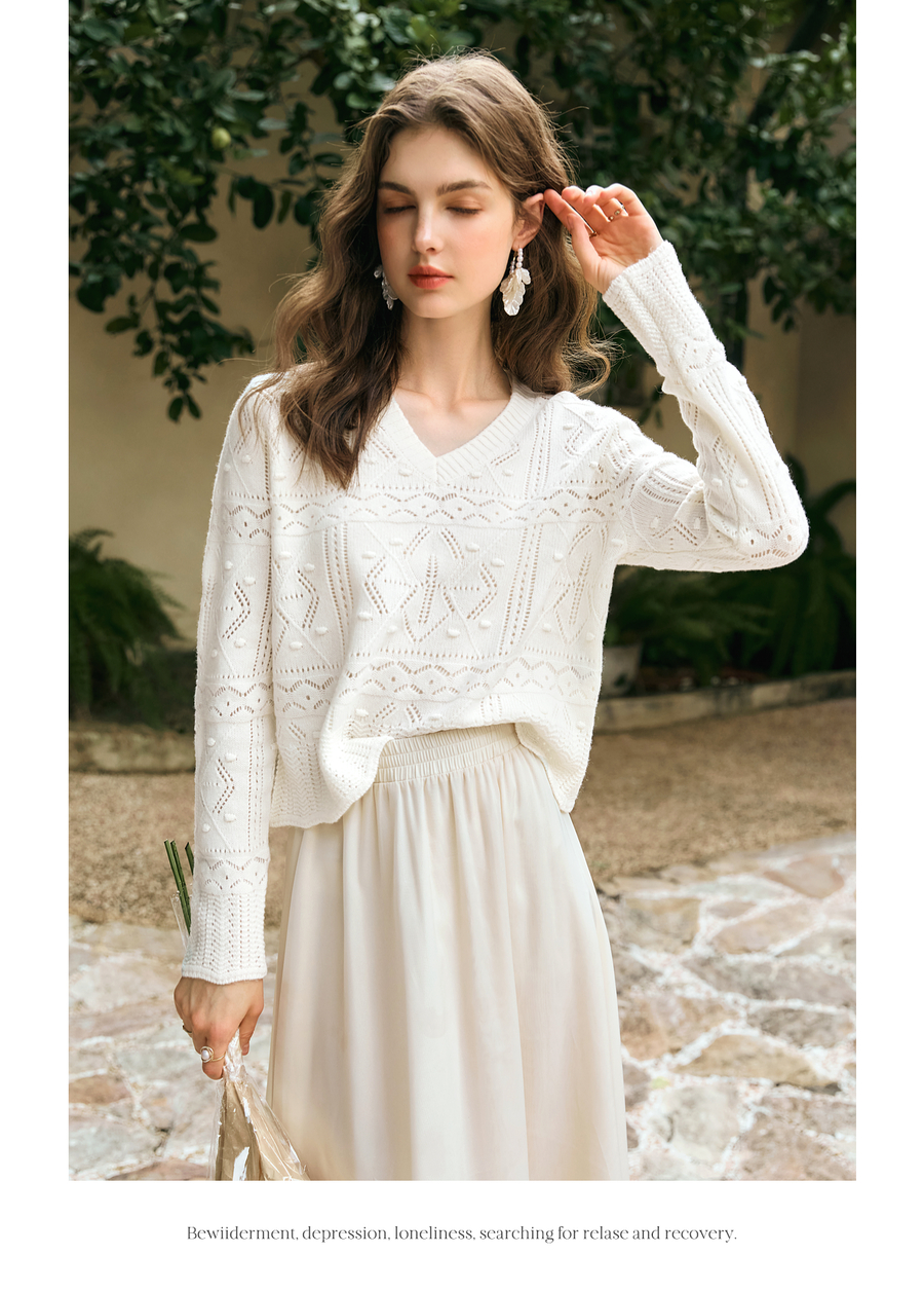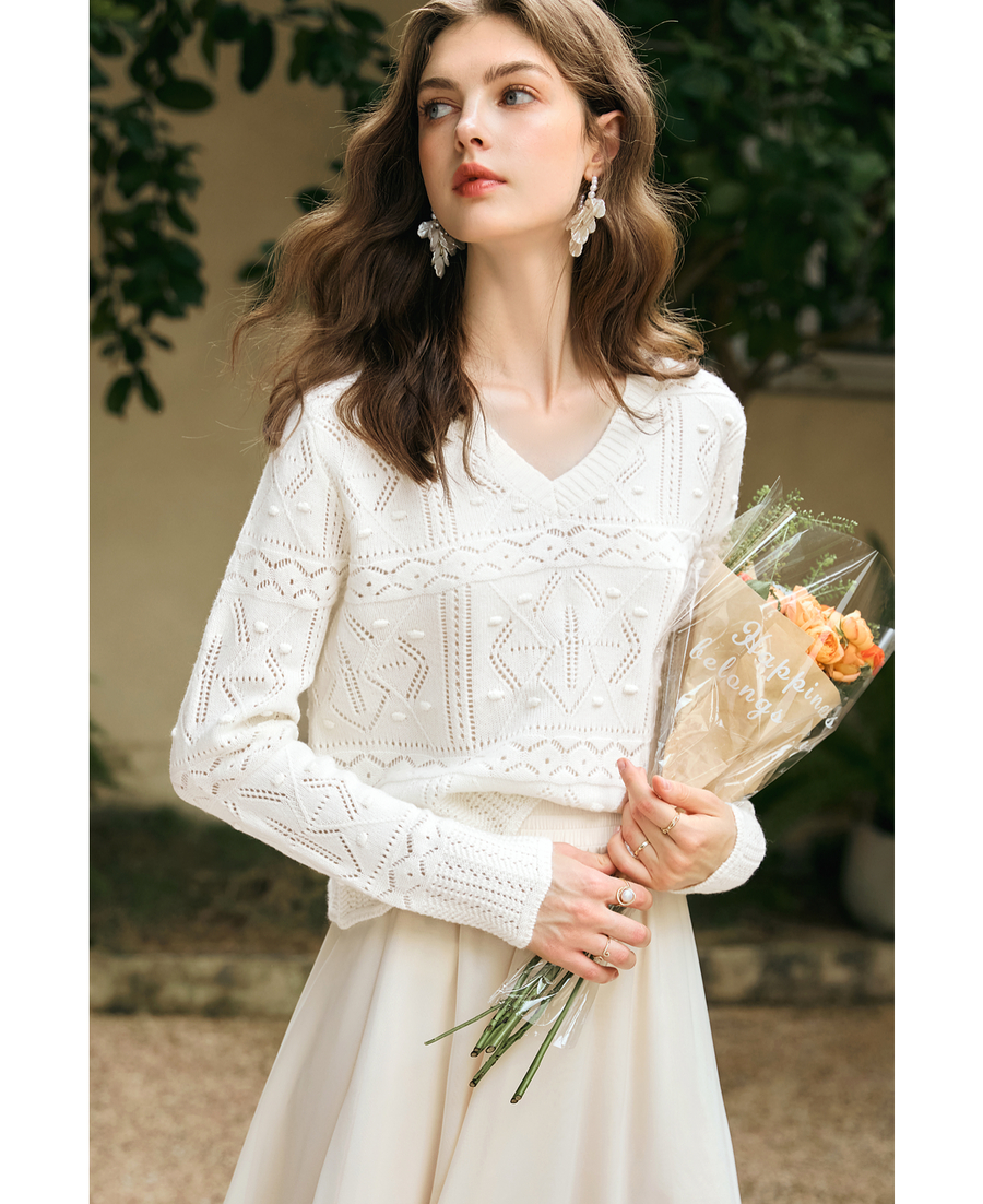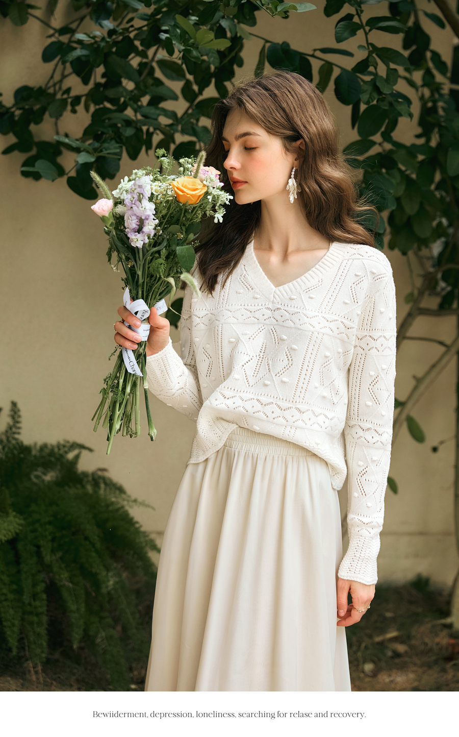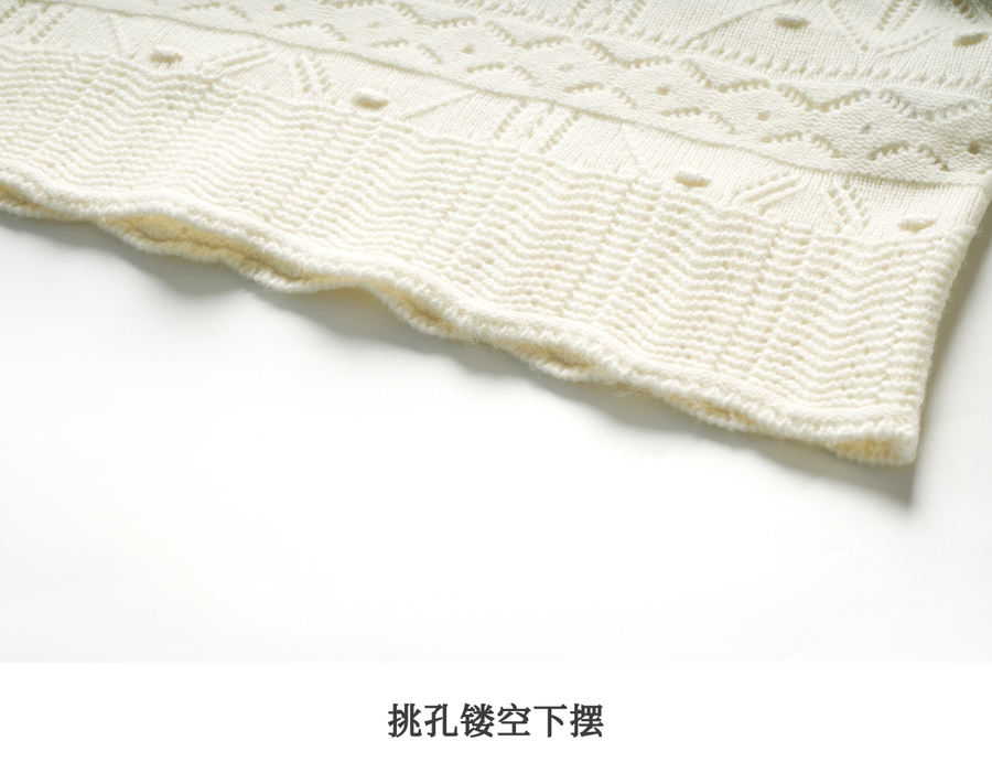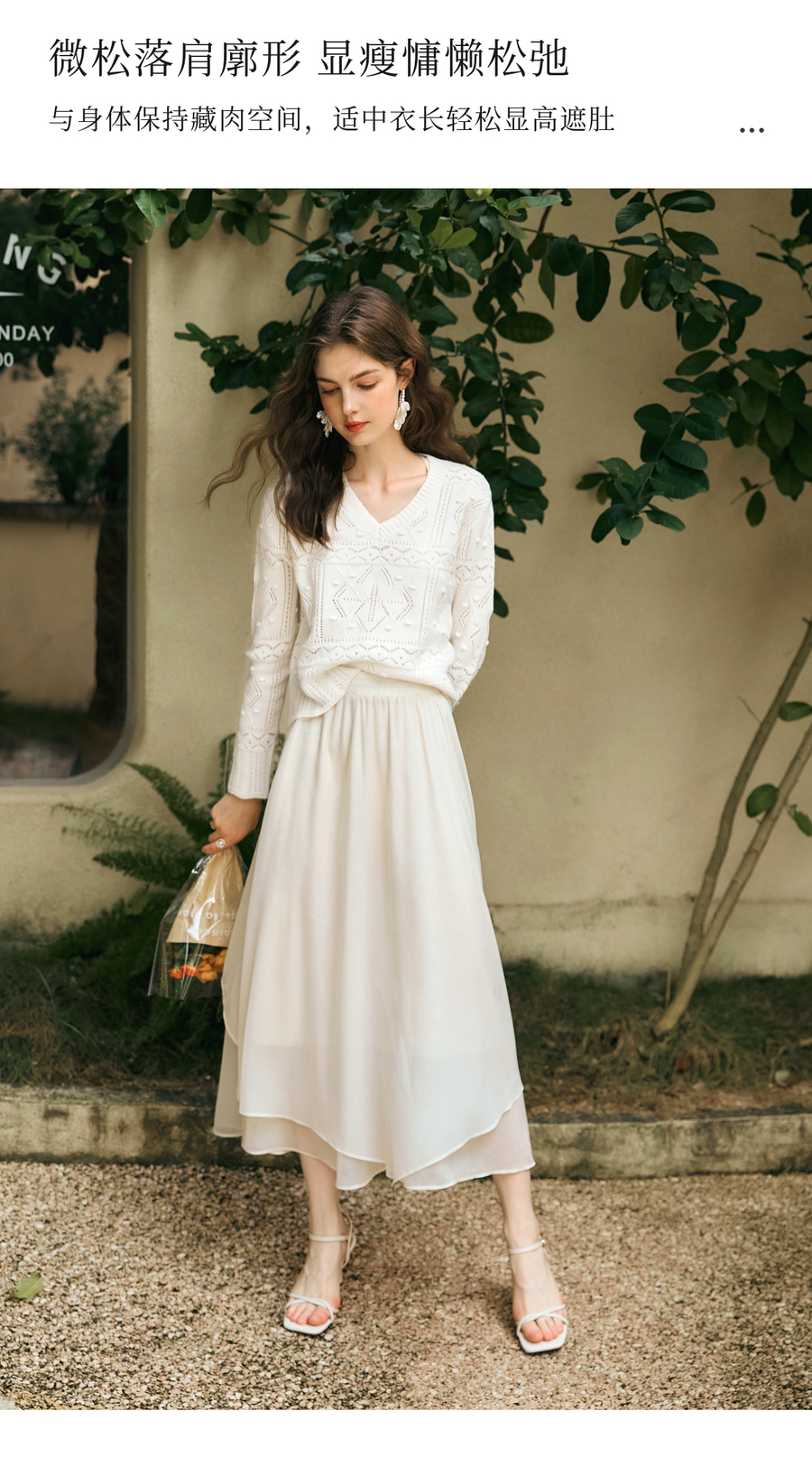 OLrain欧芮儿杏白色针织衫女冬季2024年新款度假风小V领挑孔上衣
