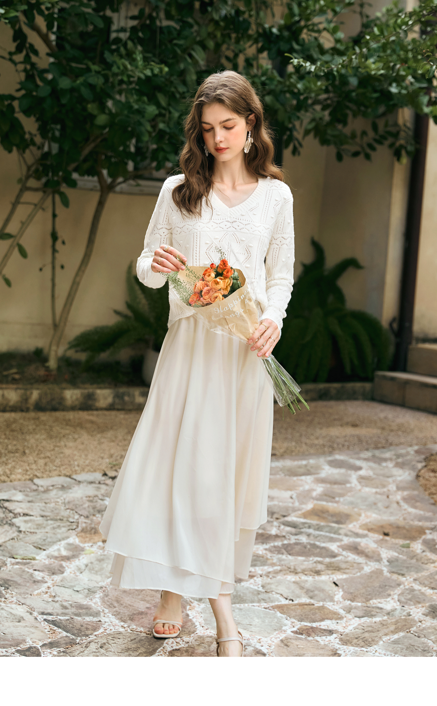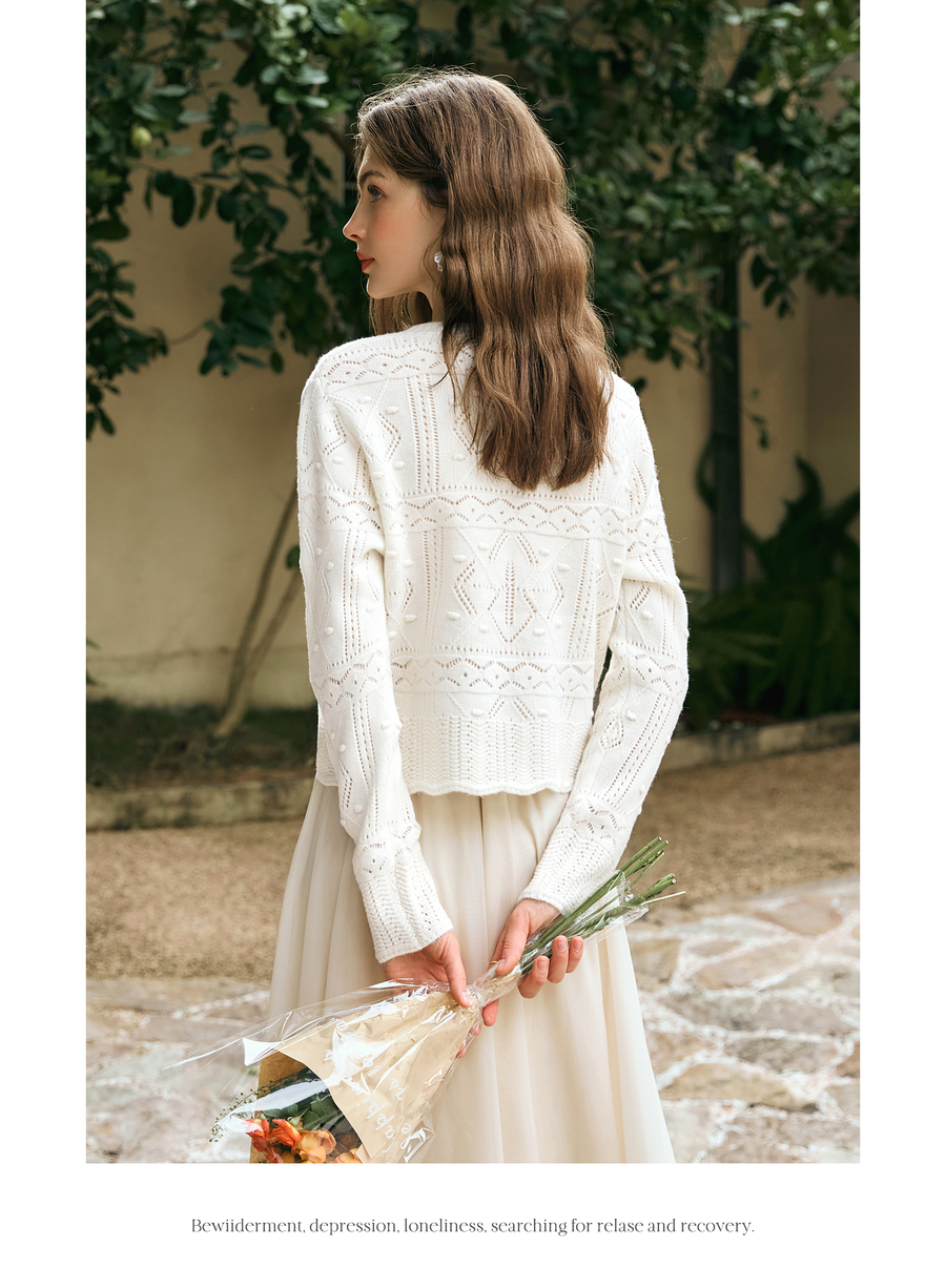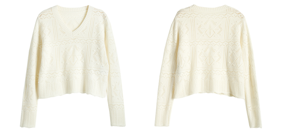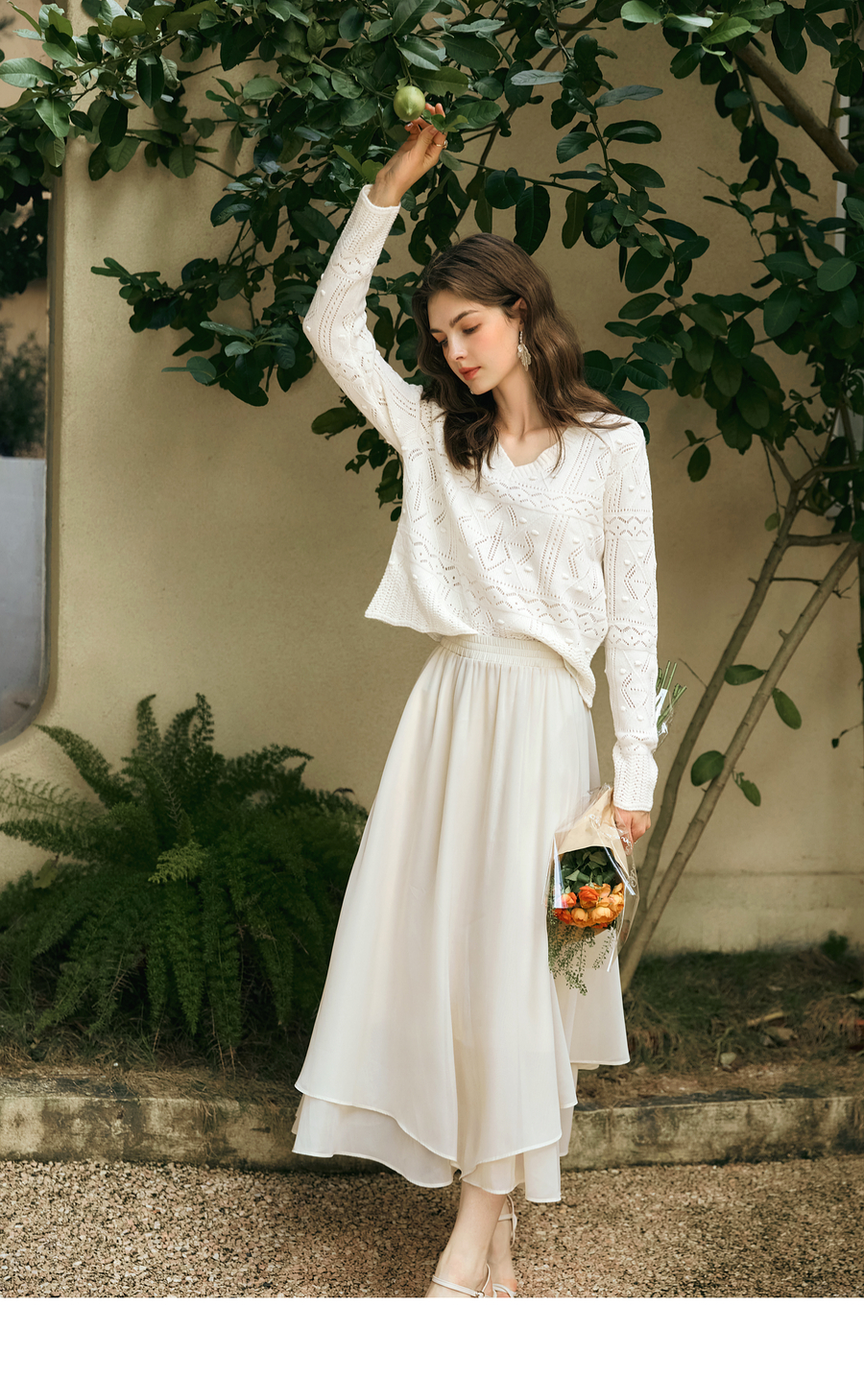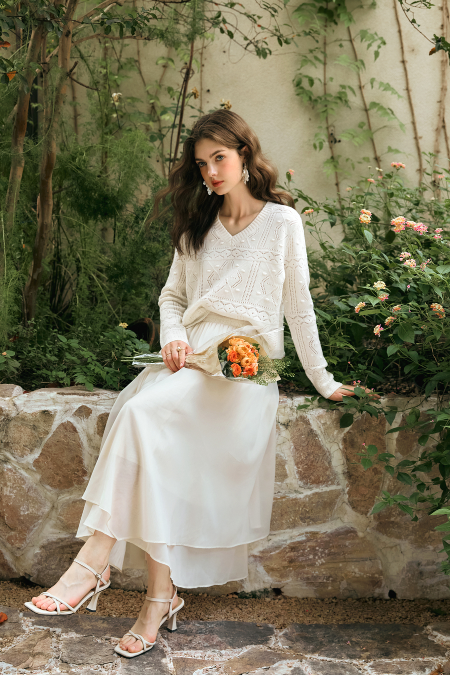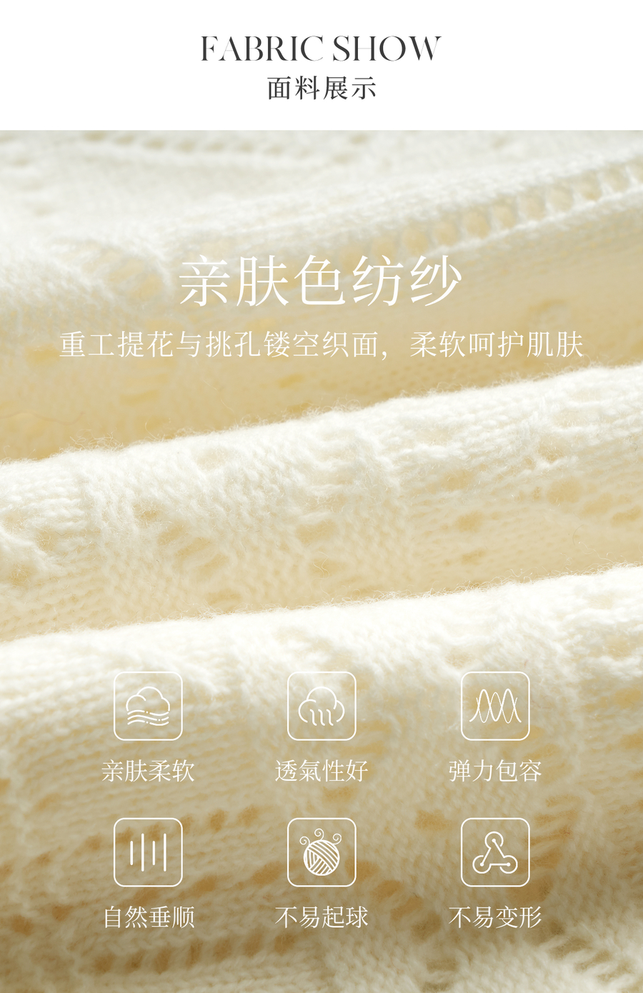 OLrain欧芮儿杏白色针织衫女冬季2024年新款度假风小V领挑孔上衣