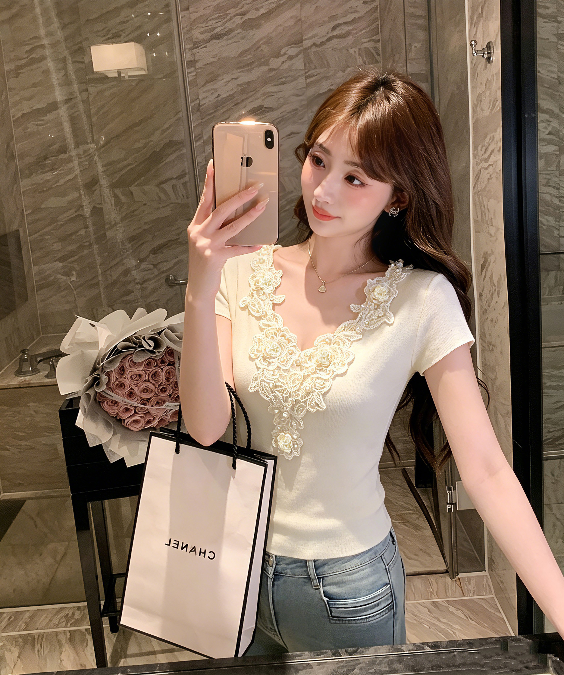 张心子【蕾丝物语】精致蕾丝花边针织衫女修身显瘦夏新款V领上衣 U2604012