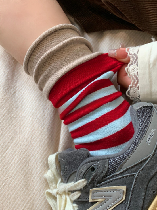 今日份很会穿的大学生! 秋日韩妹~ 独立设计师款 条纹双袜口撞色亮色系堆堆袜 无骨袜头,精梳棉 好适合入秋穿!