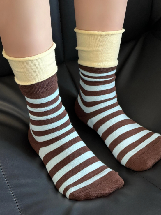 🎉🎉🎉【美拉德双袜口条纹中筒袜】👉1.无骨袜头高支优质精梳棉 ,🍁含棉量高,棉料软乎糯唧唧 ~ 2.条纹双袜口撞色亮色系