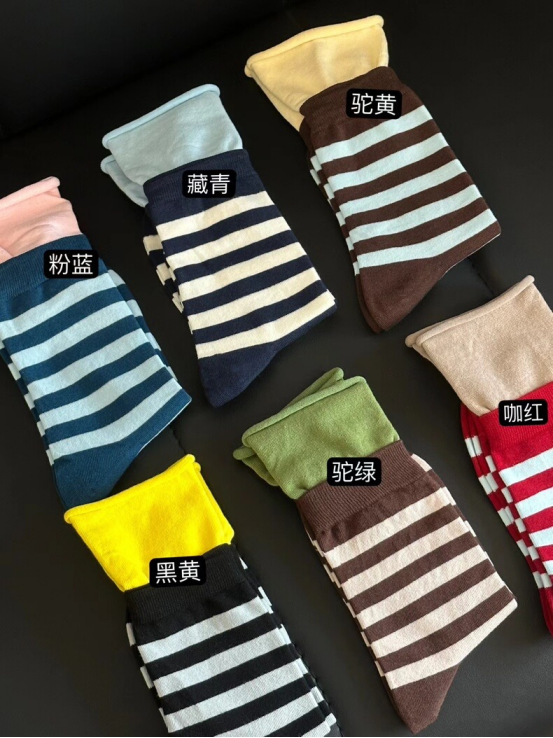 无骨袜头高支优质精梳棉 含棉量高,棉料软乎糯唧唧 条纹双袜口撞色亮色系,假两件的袜口