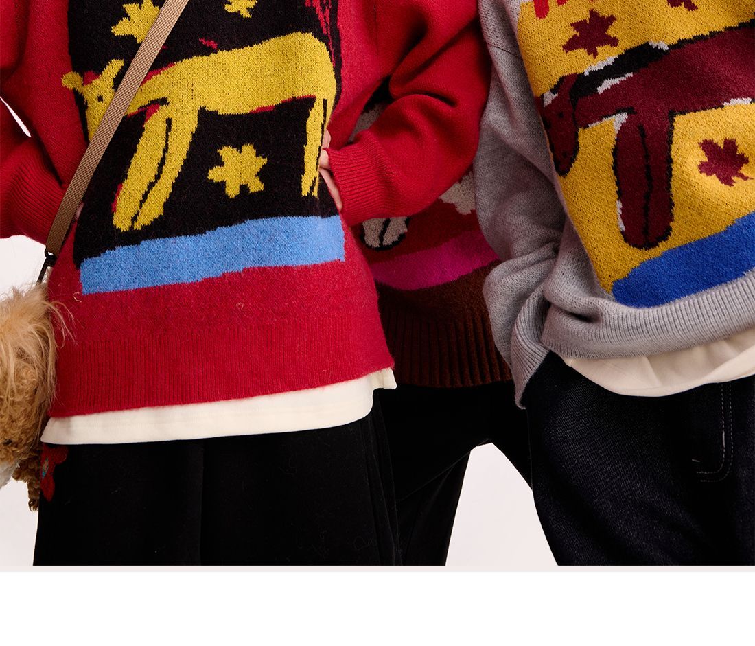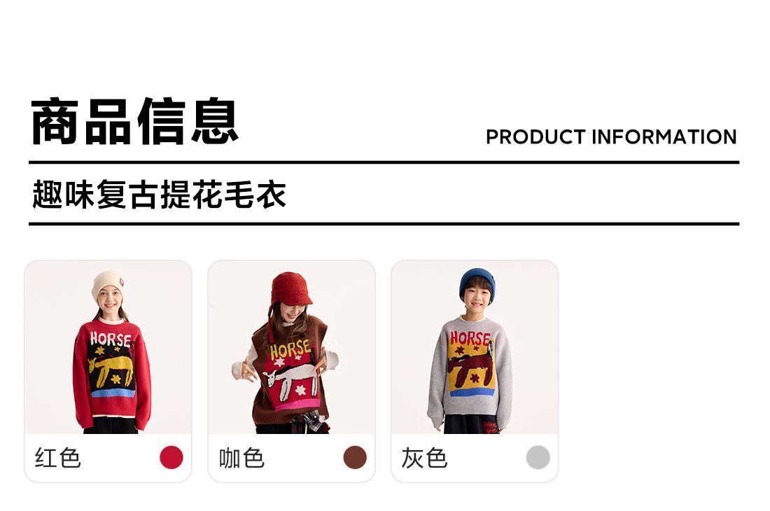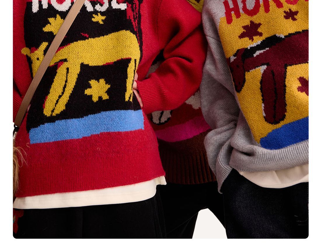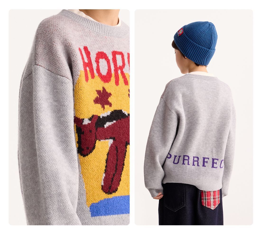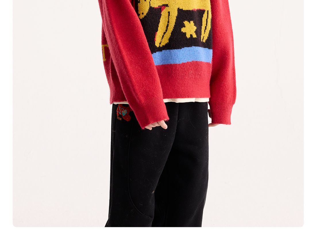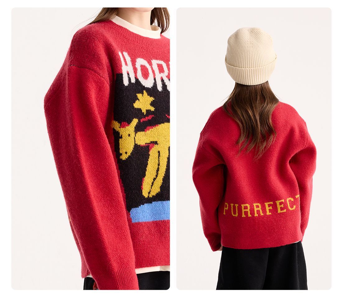 fx-【超级马力】咕噜日记儿童趣味复古提花毛衣马年亲子装新年红色款PDMY2530