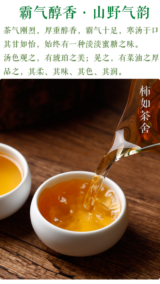 对于轻口感的茶友来说会感觉生猛, 经过2-3年的陈化后。 厚实的韵味,高扬的蜜香就会显现, 这种厚沉的韵与高扬的蜜香高度融合, 浑然一体的感觉, 让很多老茶客为之痴迷。 耐泡度极高, 15泡无弱化,20泡仍清亮, 越泡越清甜, 而在云南其他茶区中难找到风格近似的茶品! 所以,老班章的走红绝非偶然