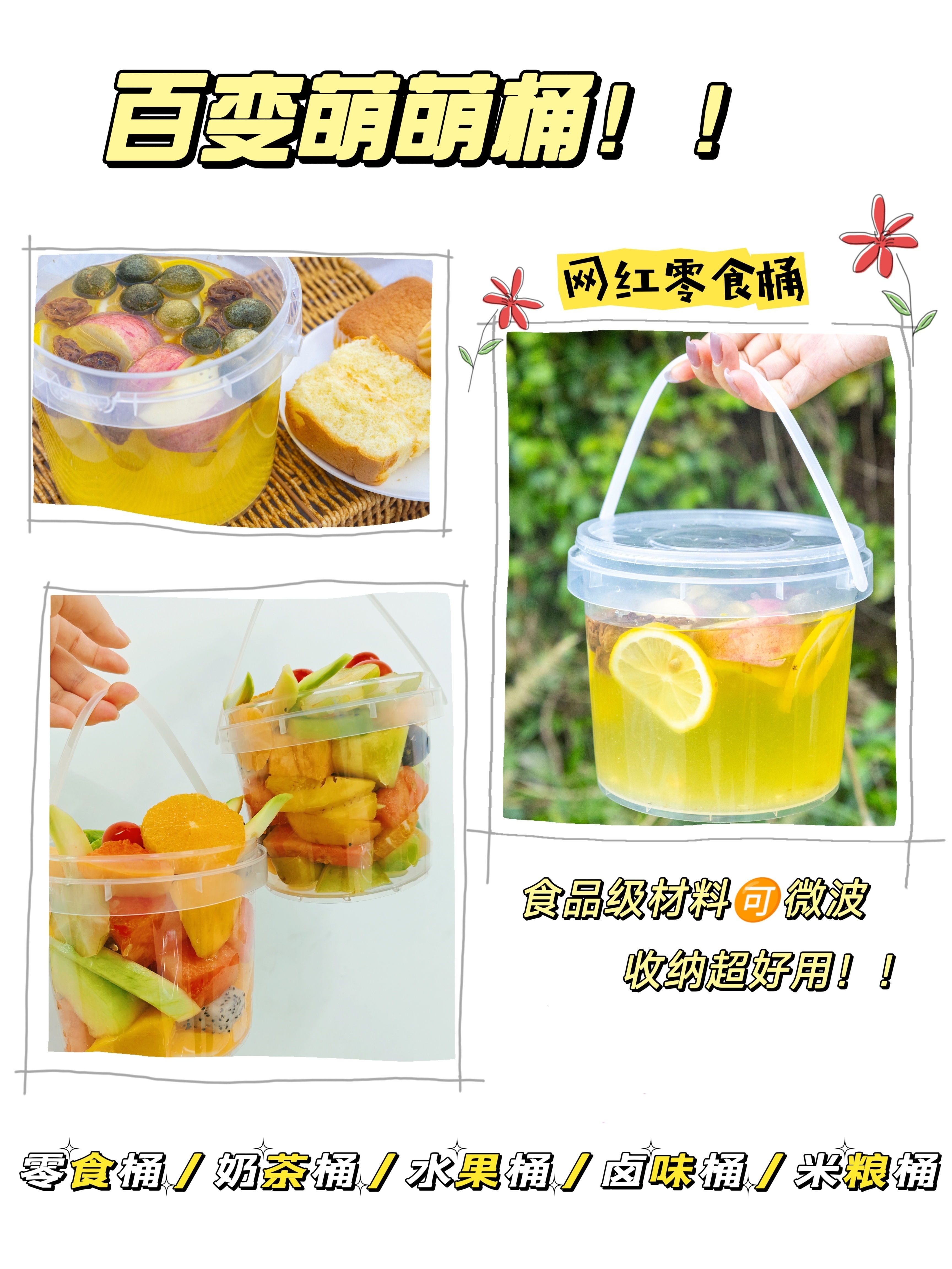1桶多用,萌萌桶还有大用途 PP5食品级包装桶,质地轻盈,材质安全 可冷藏,可微波炉加热 用来装饼干、装杂粮、装水果、装饮料都很nice! 不论是食品储存,还是杂物收纳 桶桶都能胜任!