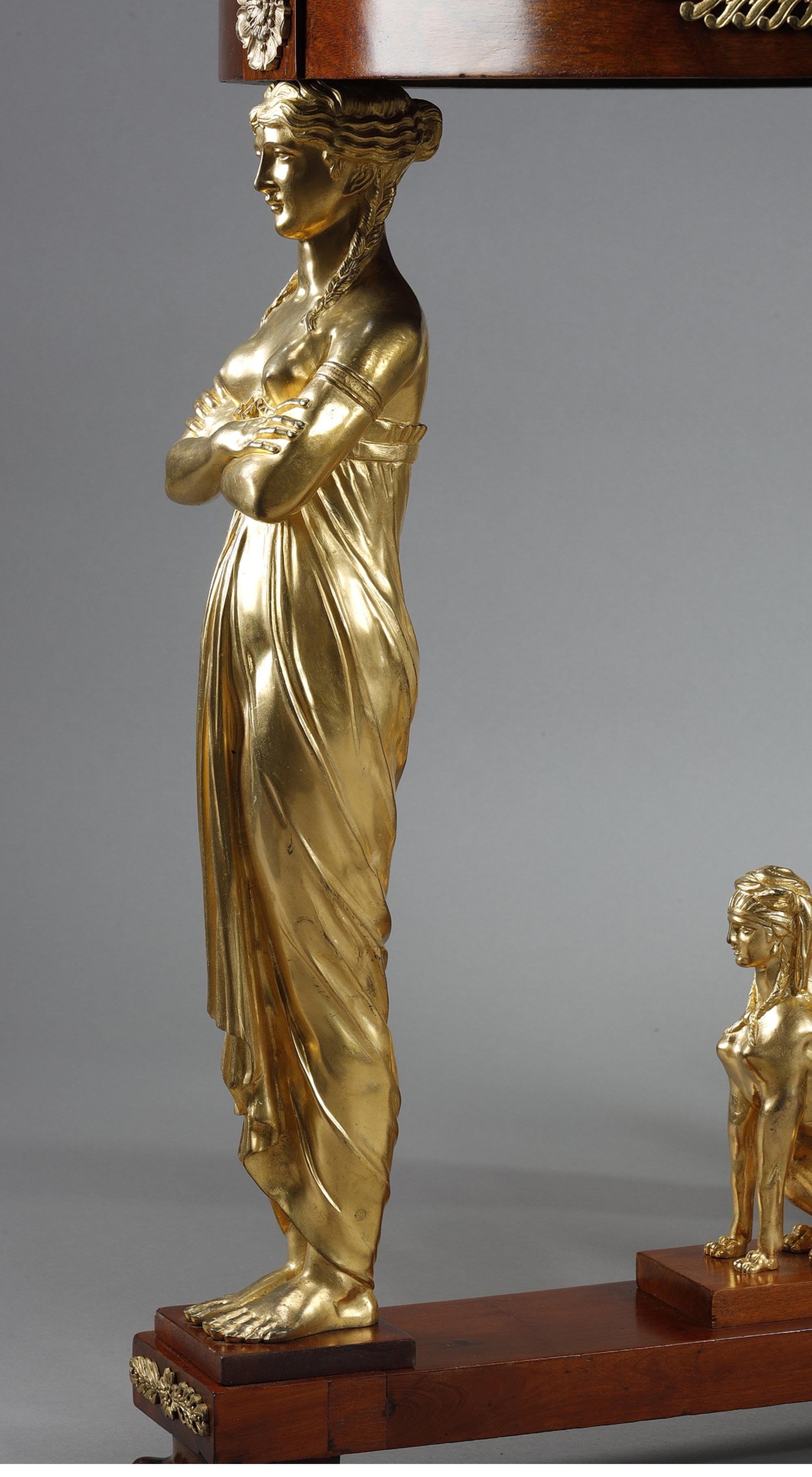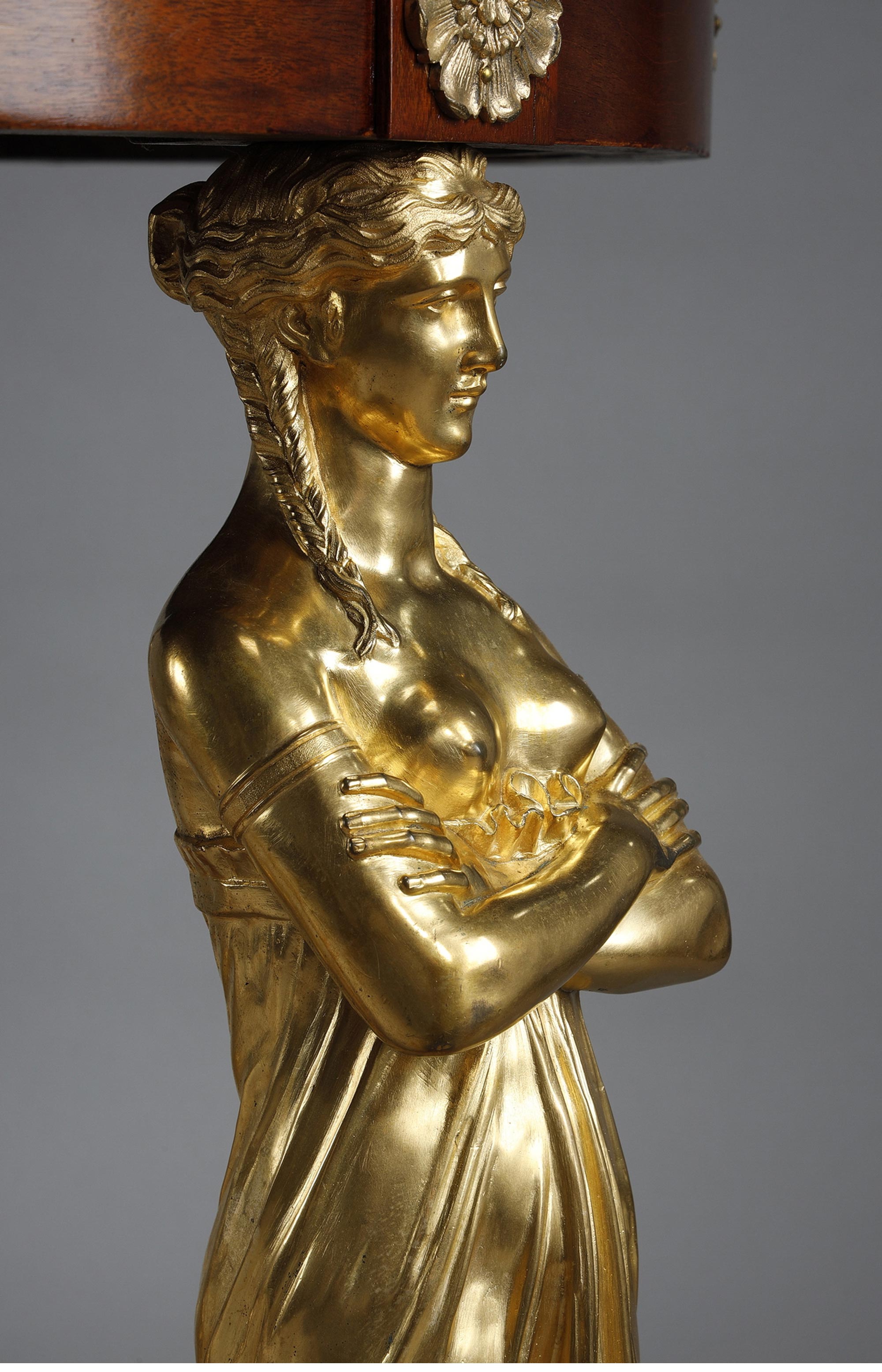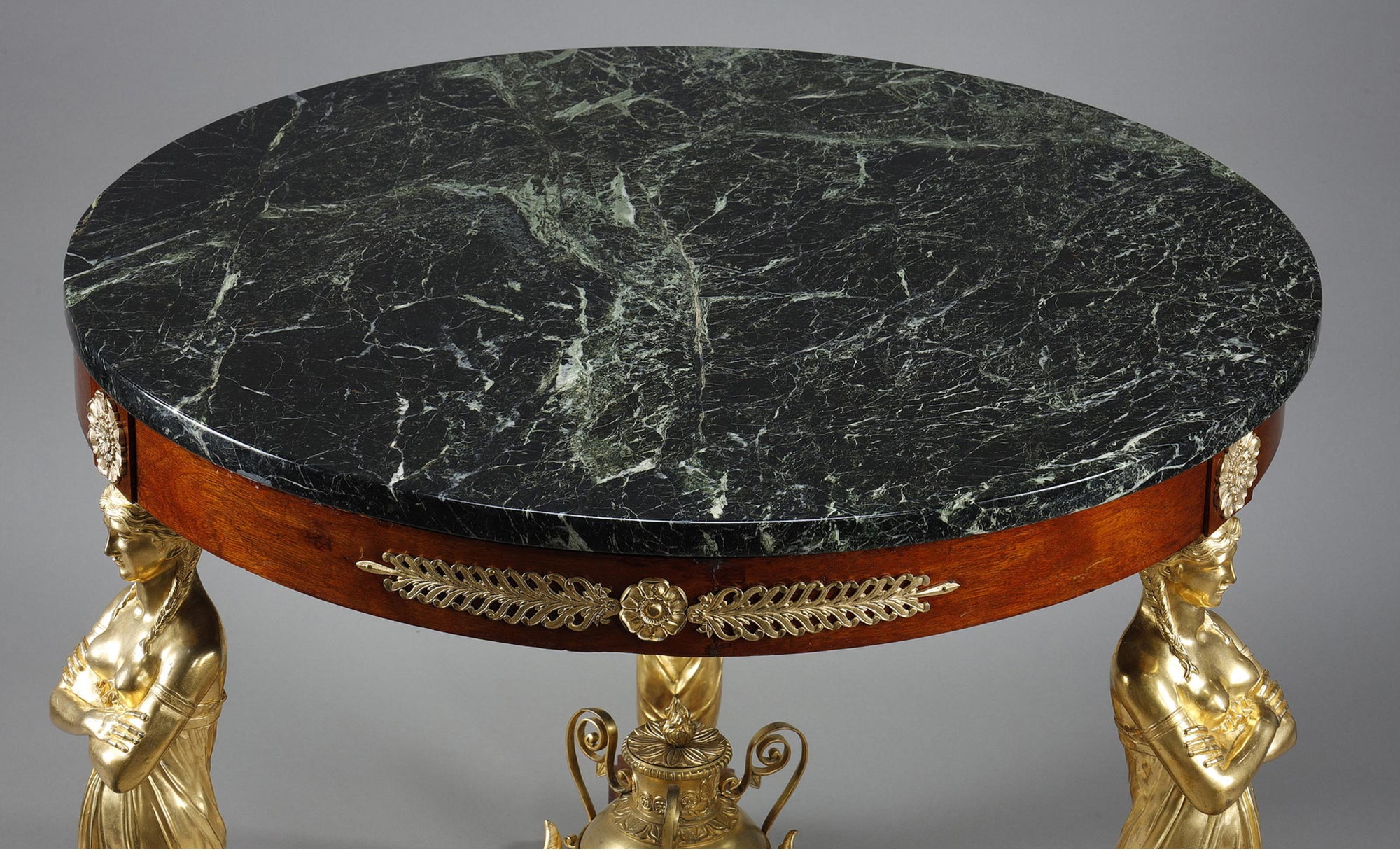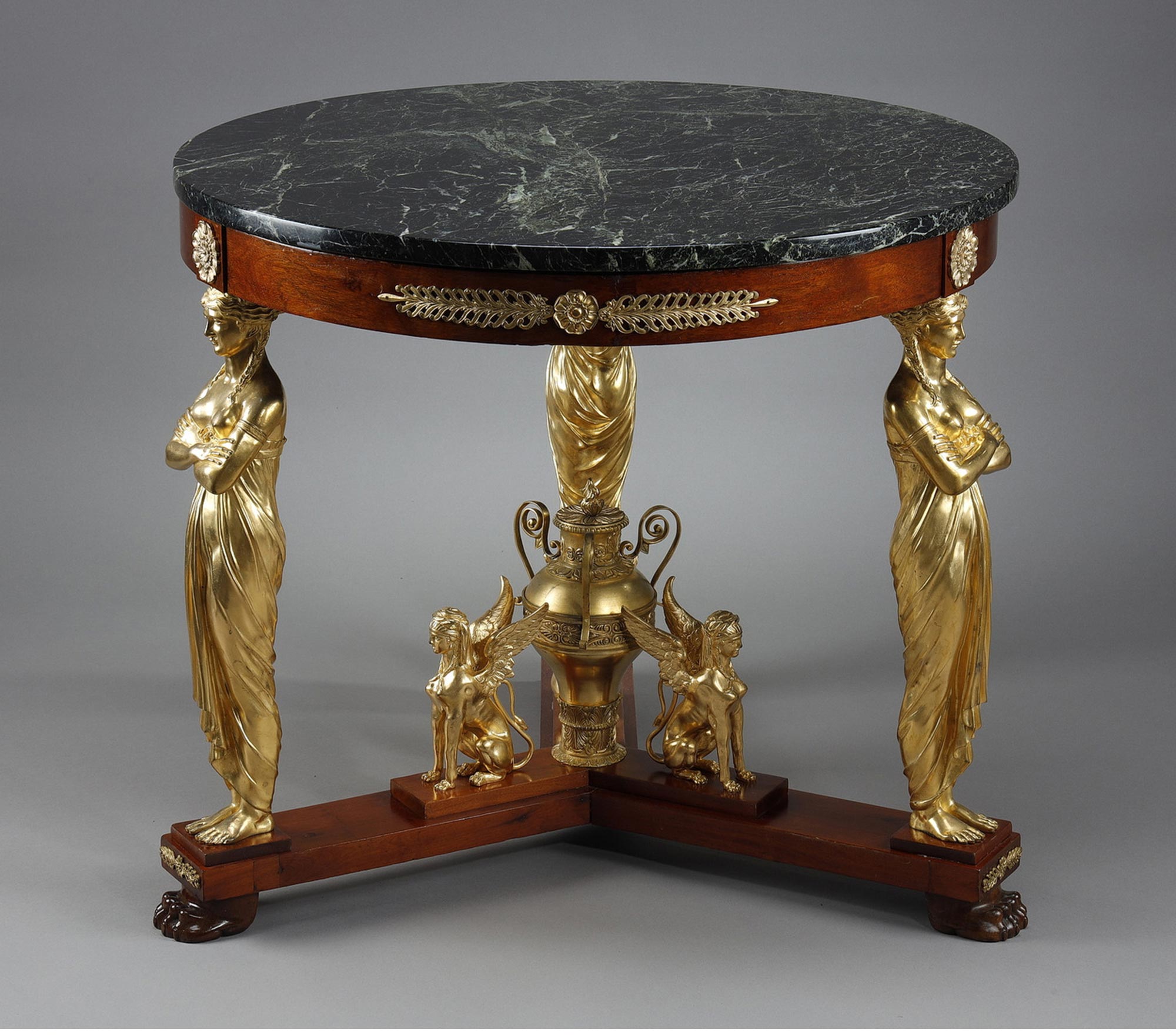 19世纪法国出品家具大师雅各布·德斯马尔特设计帝政风格铜鎏金精雕女神柱装饰大理石台面桃花心木圆桌