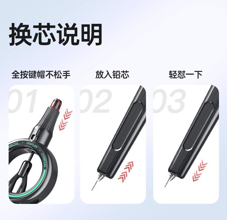 按动收铅、出铅 安全更便携 3秒快速收进笔袋 不怕扎手,更不怕圆规脚把把笔袋扎破! 保护铅芯不易断!