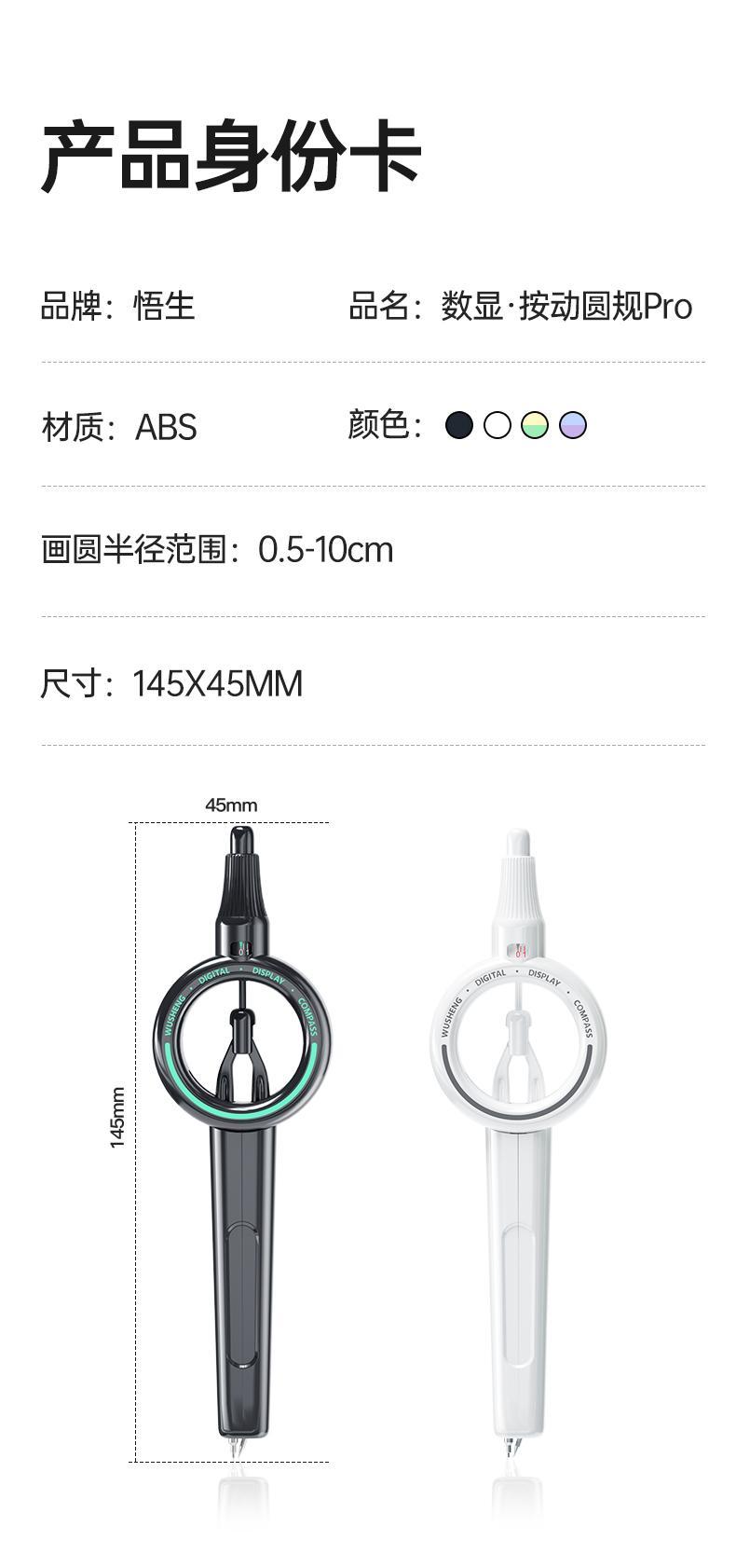 【商品名称】悟生数显按动圆规Pro 【发货时效】48h内 【物流说明】新疆西藏不发 【售后说明】1.商品非质量问题不支持退换;2.质量、缺件问题请签收后48小时内反馈,过期无法为您处理喔;3.快递送货外观有严重破损的请拒收。