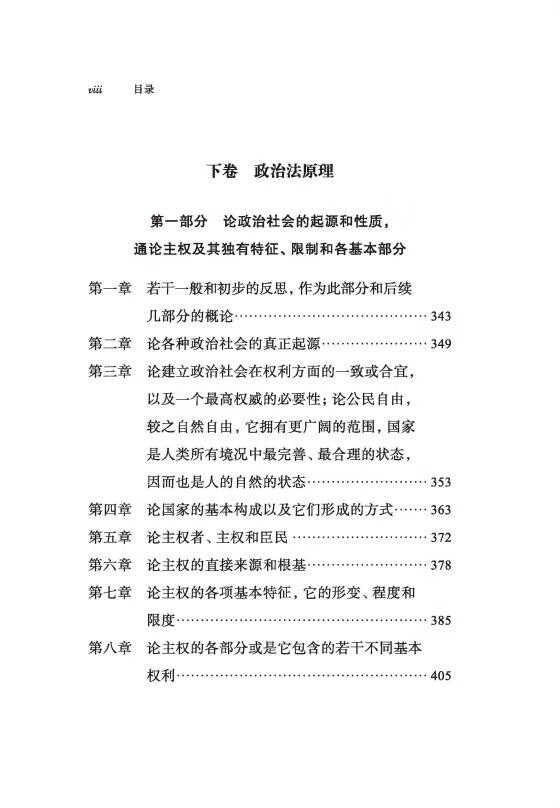 在下卷“政治法原理”部分,布拉马克讨论了政治社会的起源,以及主权的性质、特征及基本组成部分。对于自然法和政治理论尤为关注的政府形式与政体问题、政治权力与宗教的关系、战争权与征服等问题,布拉马克也进行了深入的探讨。