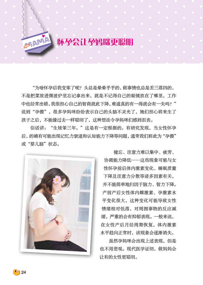 ★怀孕期间,孕妈咪的大脑工作速度相对较慢,是因为大脑对工作重点放在了照顾孩子身上。孕妈咪们不要被“孕傻”所吓倒,这只是暂时的。