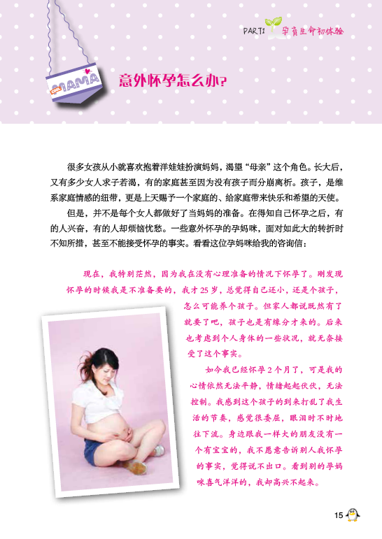 正是以上的原因促使我完成这本书。我希望本书能为更多的孕妈咪开解烦恼,预防产后抑郁,获得更多的正能量,以主动、积极的态度完成人生中的重大转变;也能为更多的准爸爸提供一些方法和支持,使全家人在正能量中迎接小天使的出生,并且将正能量延续到家庭未来的生活中。