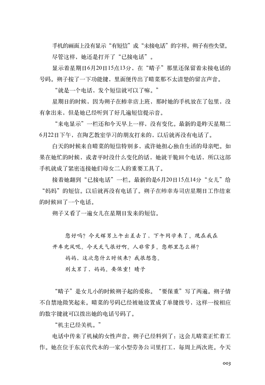 沟口晴菜留下了一条短信“我去见网友了”,自此杳无音讯。独自抚养她长大的母亲日野朔子悲痛欲绝,誓要找到女儿的下落。当警方介入,开始追踪调查之际,第二起事件发生了……一起本来貌似单纯的失踪暗,随着晴菜的母亲日野朔子、丈夫沟口辉男、网友永泽和陶艺师秋元的纷纷卷入变得扑朔迷离、错综复杂。真相只有一个,然而那些源于人性、源于亲情的证词却慢慢发酵出另一种结局……
