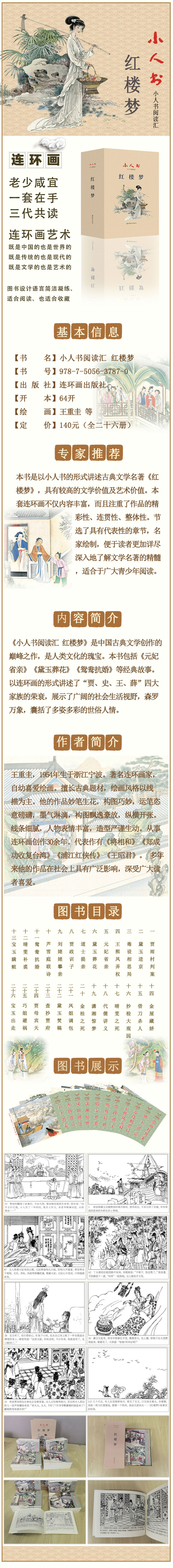 《红楼梦》是中国具文学成就的古典文学巨著,中国古典文学创作的巅峰之作,中国文学史上的长篇章回小说,是全人类的文化瑰宝。本书包括:元妃省亲、黛玉葬花、鸳鸯抗婚等经典故事。以连环画的形式讲述了“贾、史、王、薛”四大家族的荣衰,展示了广阔的社会生活视野,森罗万象,囊括了多姿多彩的世俗人情。