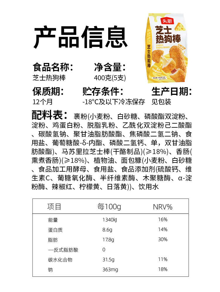 头厨芝士热狗棒(400g/包 5根)生产日期: 11月10日
