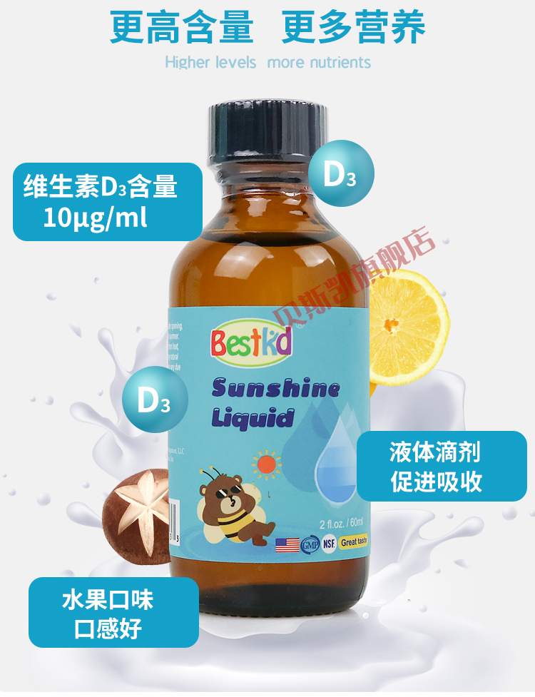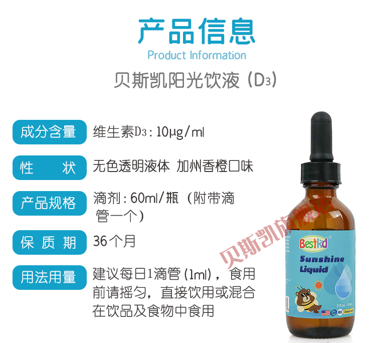 Bestkid贝斯凯阳光饮液维生素D3 美国进口 液体滴剂 香橙口味