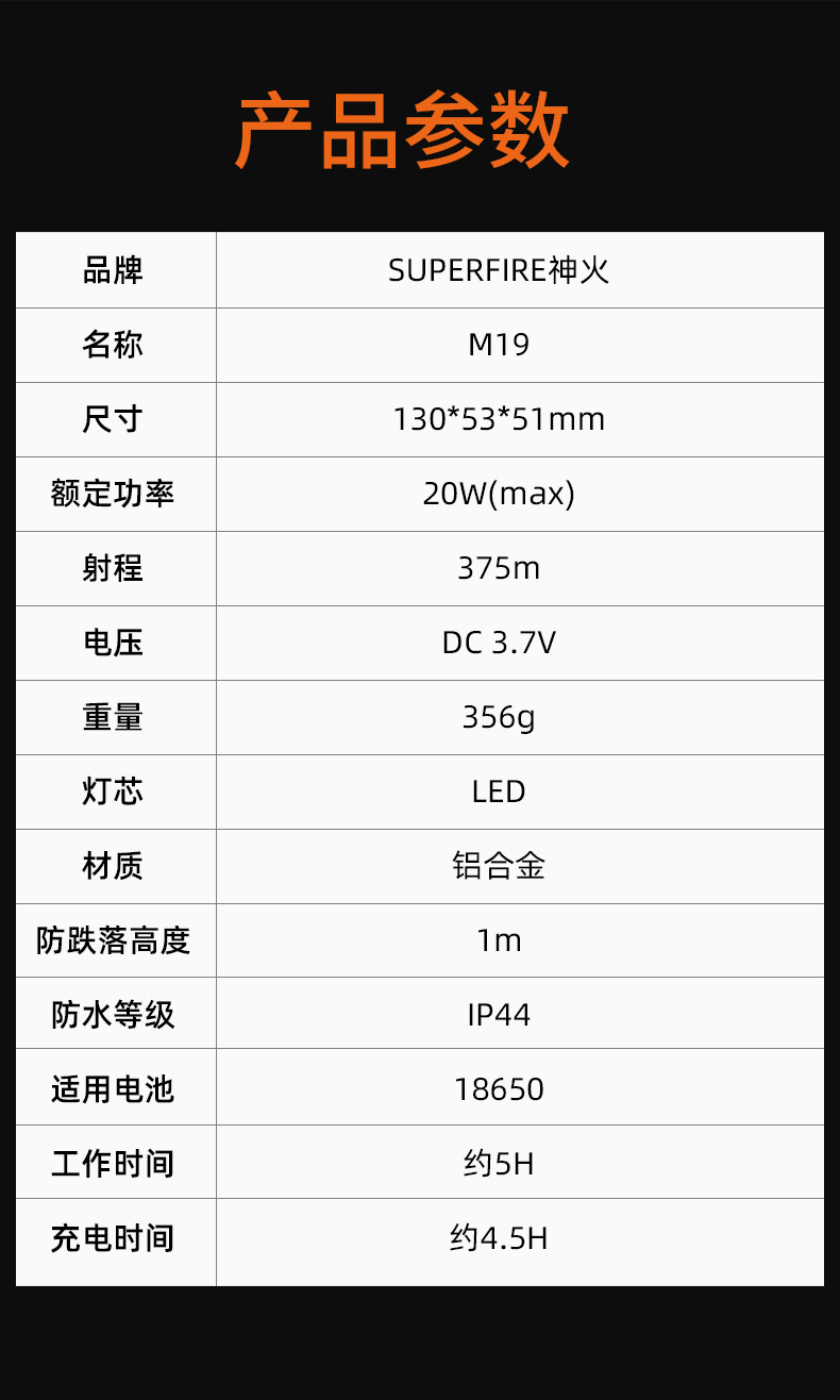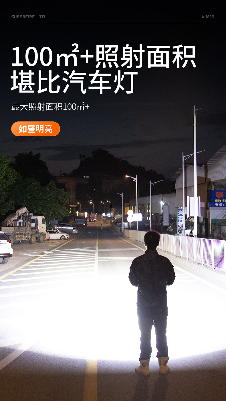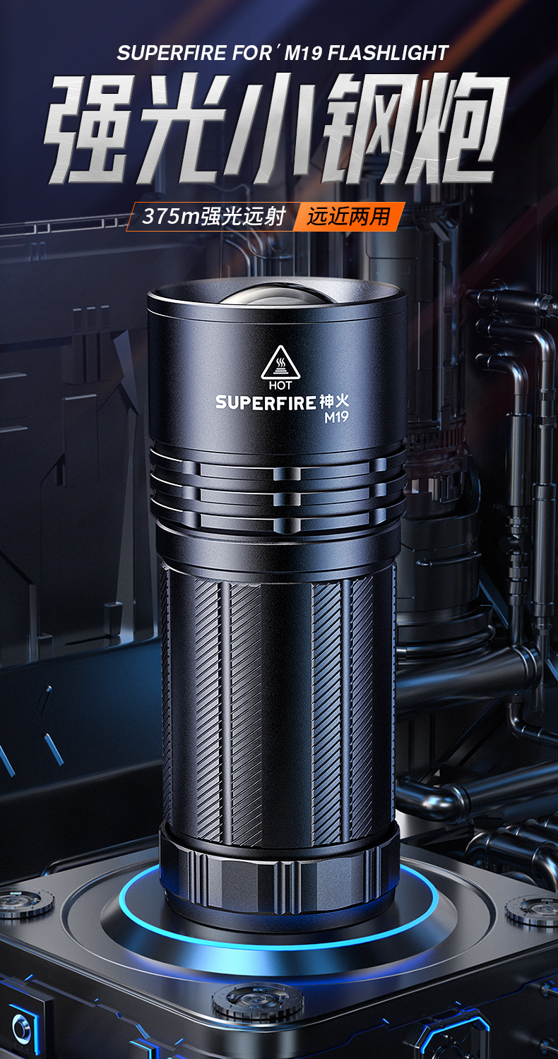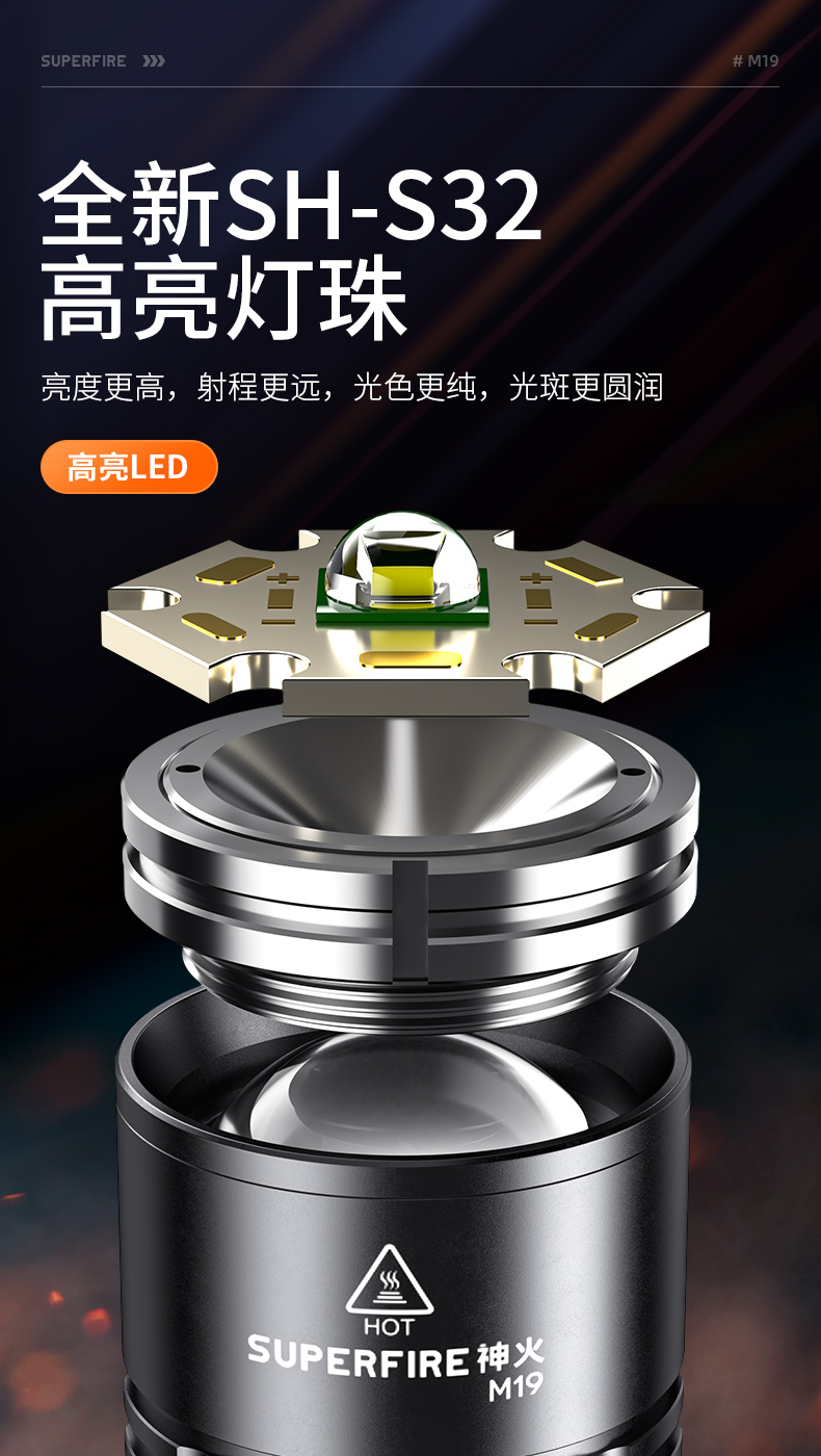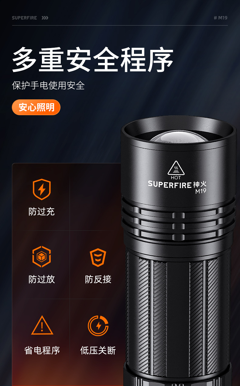 SUPERFIRE神火M19手电筒强光远射防水长续航可充电伸缩调焦户外家用应急手电