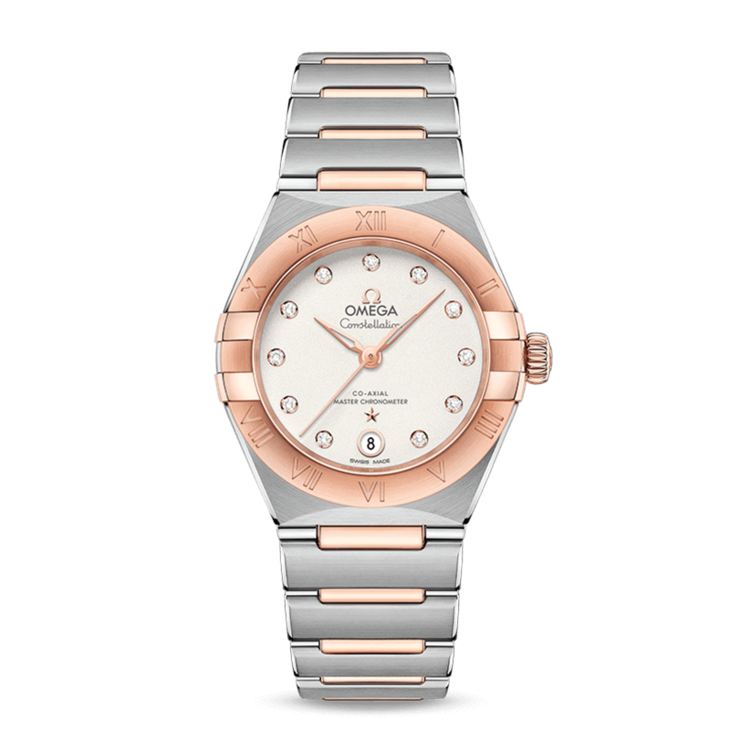 镜面材质 | 蓝宝石水晶玻璃 | 表盘 | Sedna® 18K金与精钢打造,表圈镌刻罗马数字刻度 冰霜银表盘晶莹洁白,饰有钻石小时刻度,6点钟位置设有日历窗口。指针、欧米茄品牌标识、星座徽标以及钻石托槽亦以Sedna® 18K金打造而成。 透底 |