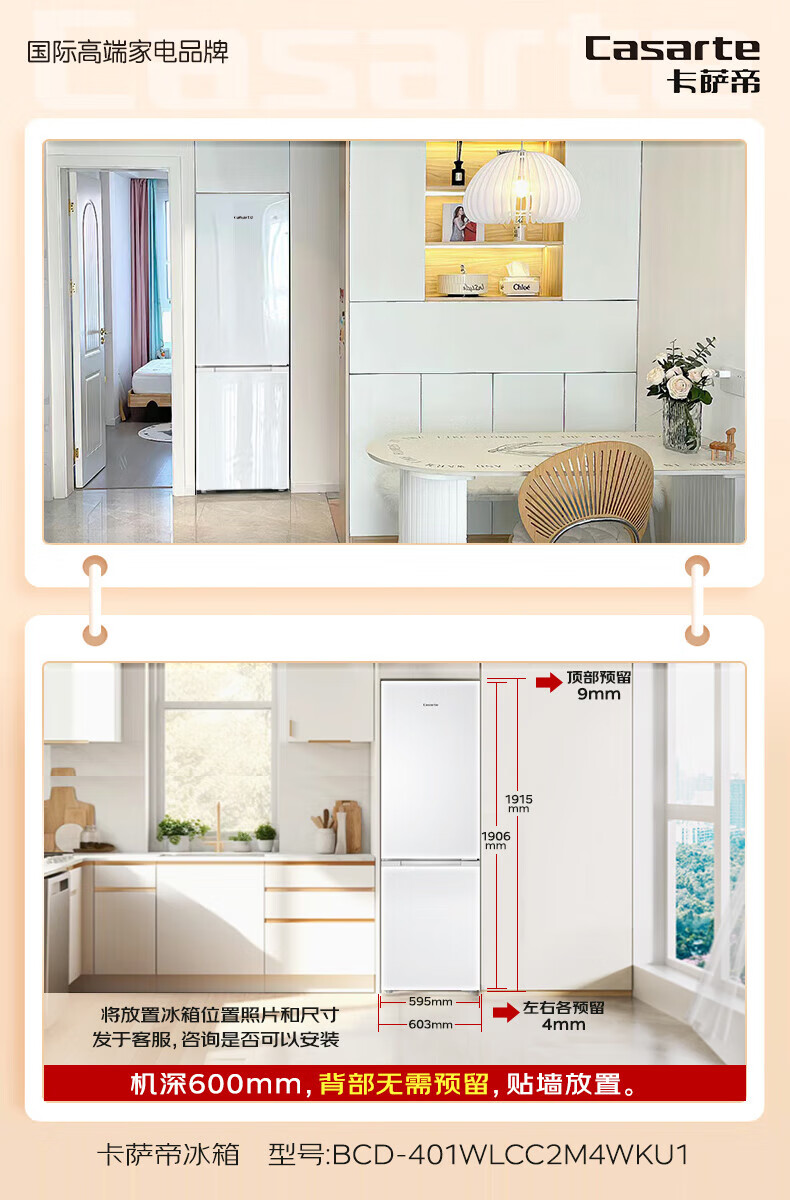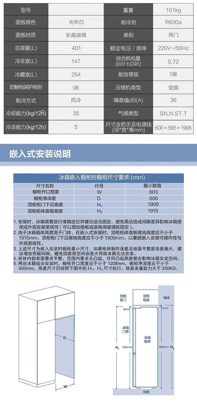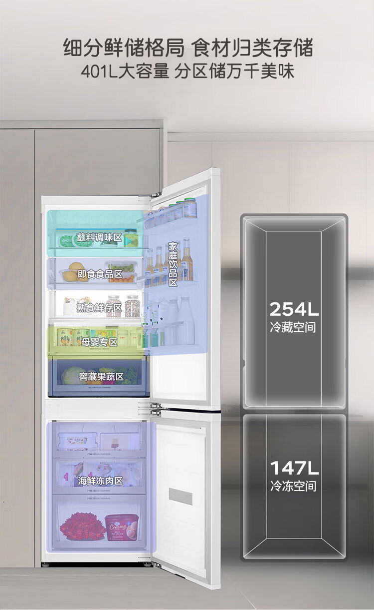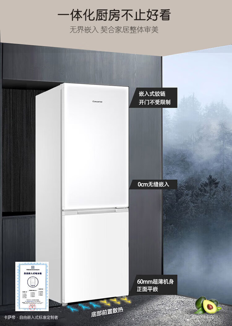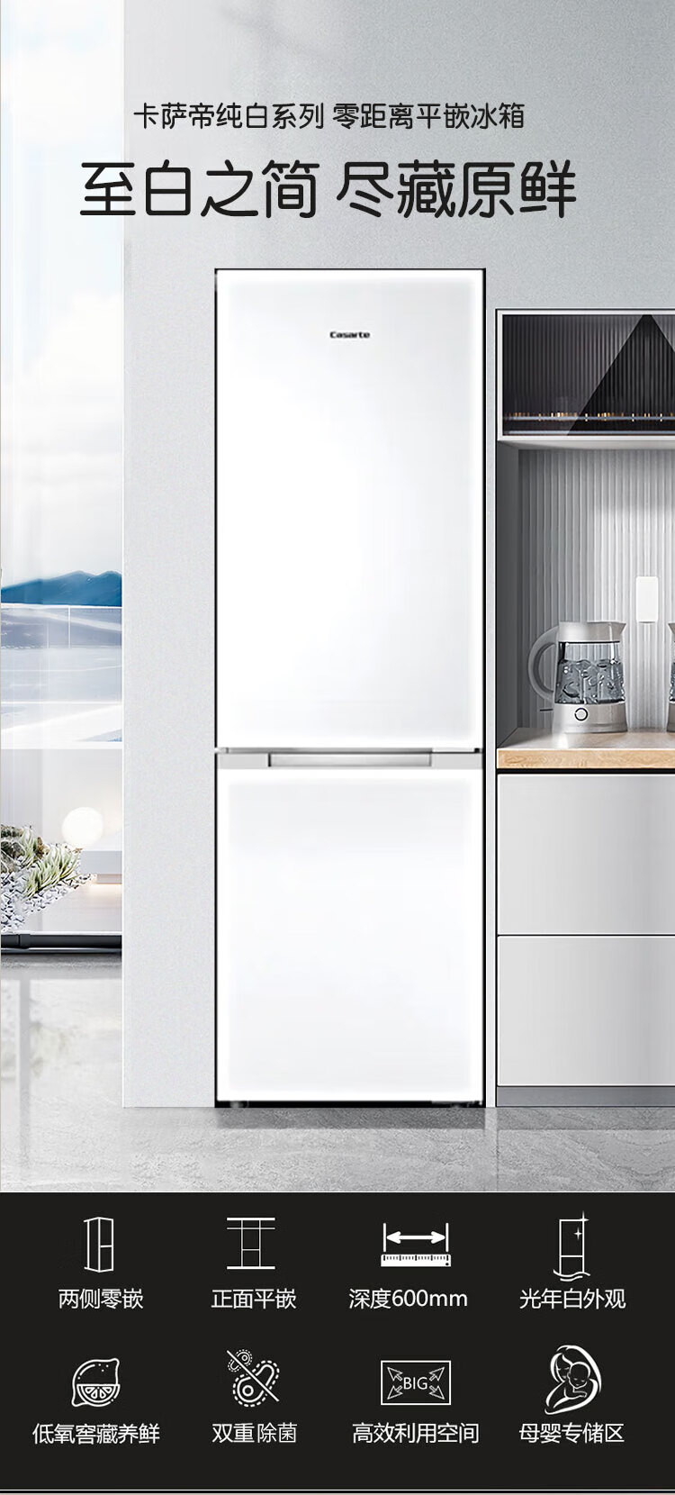 卡萨帝冰箱401升光年白系列双门零距离无界纯平嵌入60cm超薄风冷无霜变频节能一级能效低氧窖藏母婴专属 纯白系列401L+零距离平嵌+60mm超薄