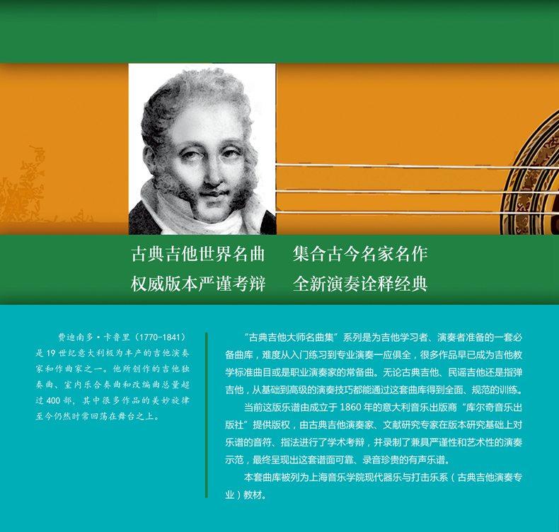 “古典吉他大师名曲集”系列是为吉他学习者、演奏者准备的一套必备曲库,难度从入门练习到专业演奏一应俱全,很多作品早已成为吉他教学标准曲目或是职业演奏家的常备曲。无论古典吉他、民谣吉他还是指弹吉他,从基础到高级的演奏技巧都能通过这套曲库得到全面、规范的训练。当前这版乐谱由成立于1860年的意大利音乐出版商“库尔奇音乐出版社”(Edizioni Curci)提供版权,由古典吉他演奏家、文献研究专家在版本研究基础上对乐谱的音符、指法进行了学术考辩,并录制了兼具严谨性和艺术性的演奏示范,最终呈现出这套谱面可靠、录音珍贵的有声乐谱。本套曲库被列为上海音乐学院现代器乐与打击乐系(古典吉他演奏专业)教材。