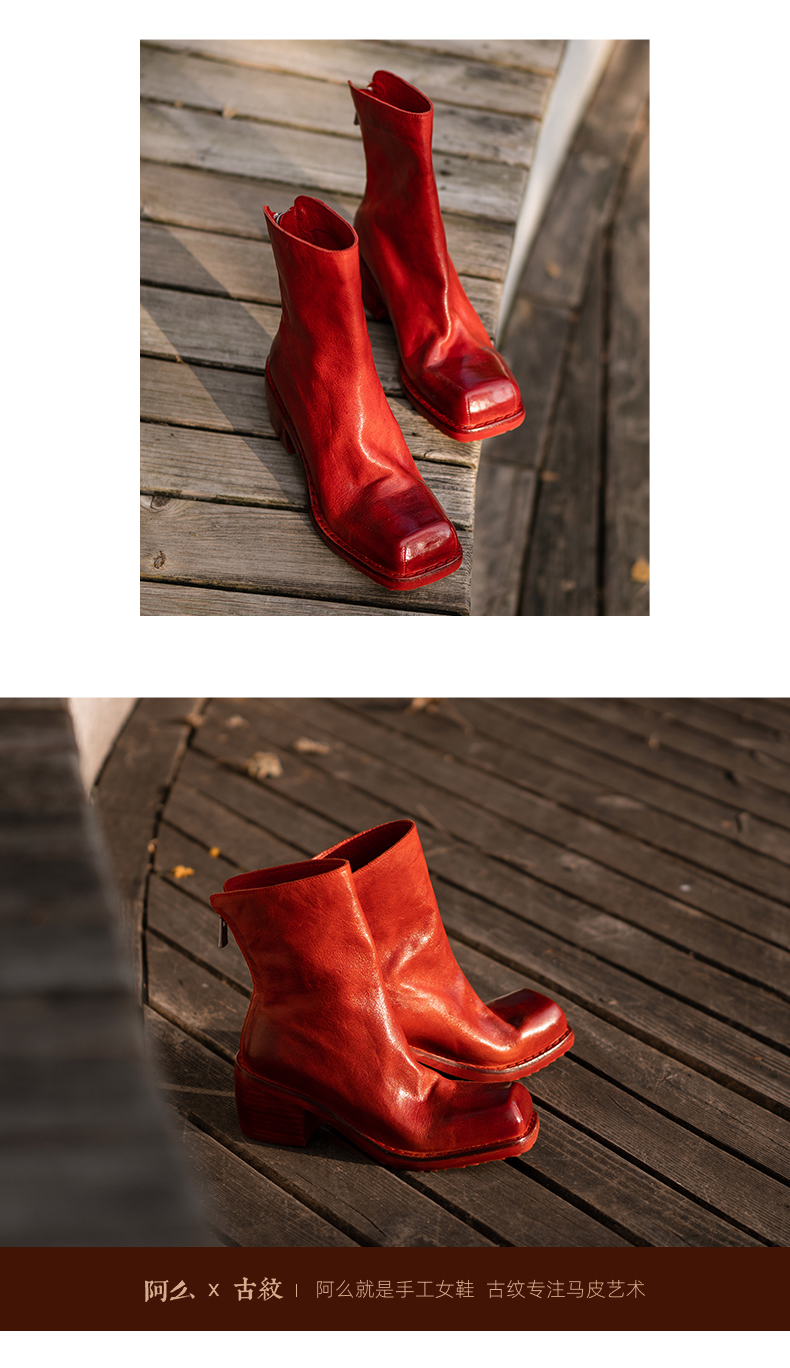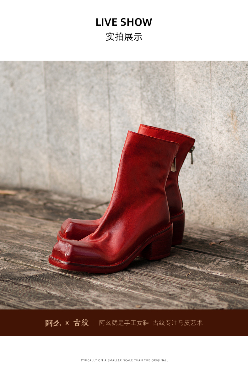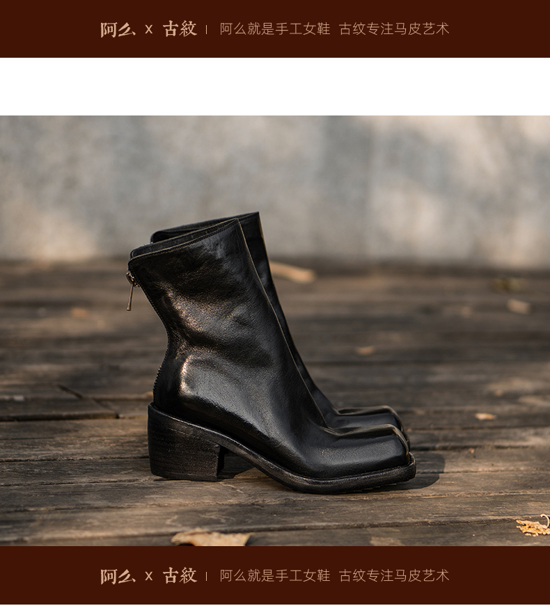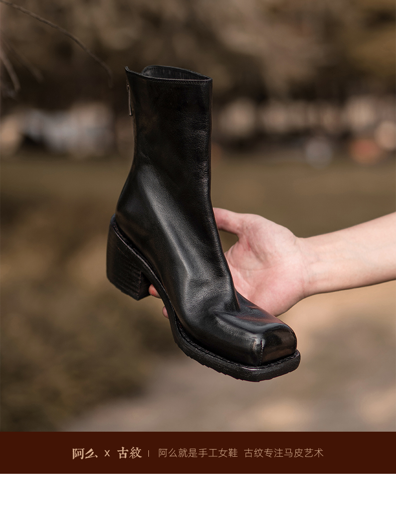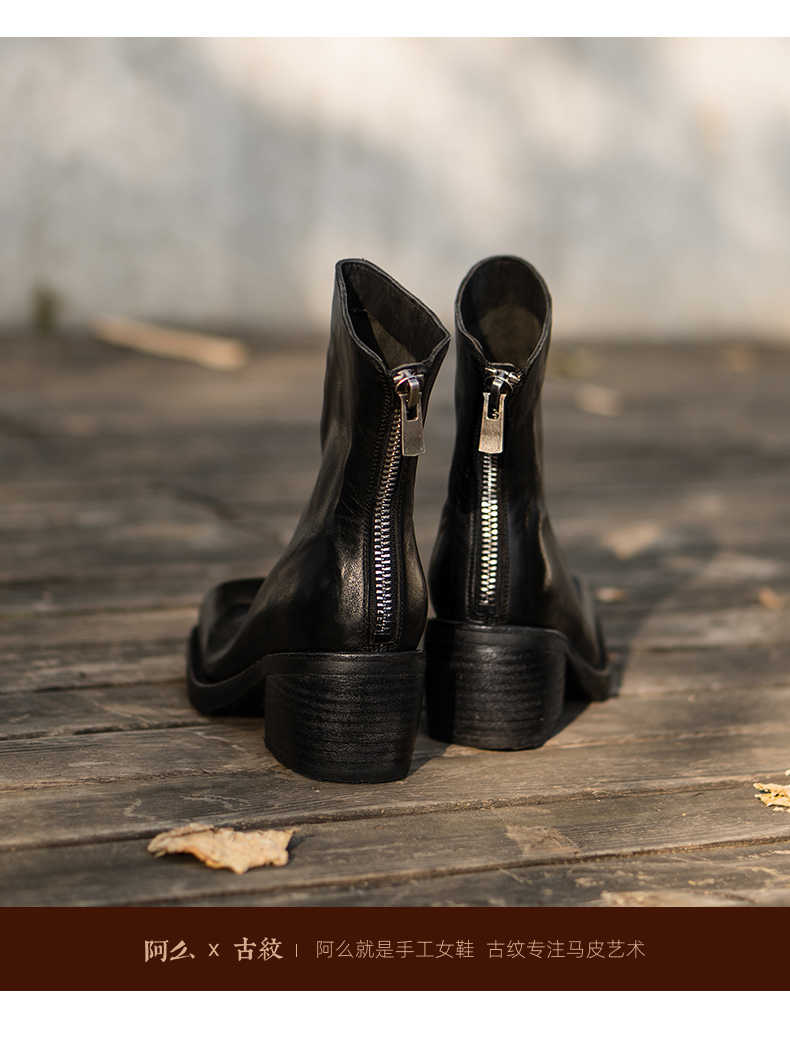 【阿么古纹马皮鞋】方头后拉链小众时尚短靴5CM复古高跟秋冬瘦瘦靴