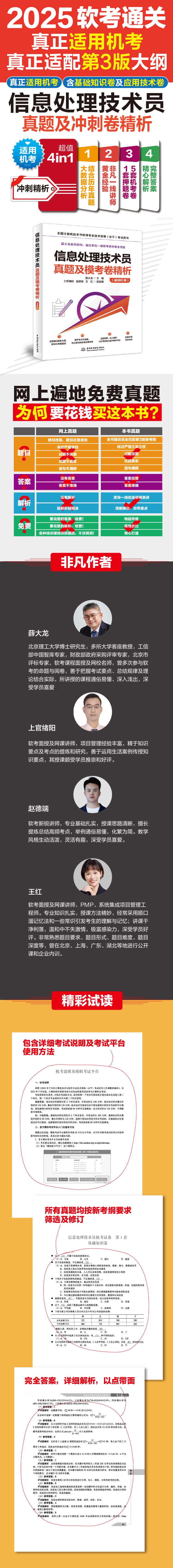 信息处理技术员第3版考试大纲已经发布,由于新版考纲相较于旧版考纲变化较大,配套发布的第3版教材与第2版教材的内容相比也有了巨大变化。这就导致历年真题、练习题等题目,无法适用于当前备考。本书各试卷中的题目,一部分是作者结合历年考试大数据分析、第3版大纲新增或发生变化的内容、机考特点、自身丰富的授课经验全新设计的,一部分尽管源自历年考试真题,但全部严格根据第3版考试大纲及教材的变化进行了针对性修改。因此本书全部题目完全适用于考生备考,考生完全不必担心新旧大纲及教材内容变化所带来的疑虑。本书所有的题目均配有深入解析及答案。本书解析力图通过考点把复习内容延伸到所涉知识面,同时力图以严谨而清晰的讲解让考生真正理解知识点。希望本书能够极大提高考生的备考效率。本书由长期从事软考培训工作的薛大龙老师担任主编。薛老师熟悉考题的形式、难度、深度和重点,了解学生学习过程中的难点。本书可作为考生备考“信息处理技术员”考试的学习资料,也可供相关培训班教学使用。