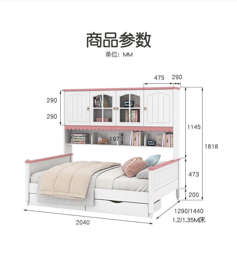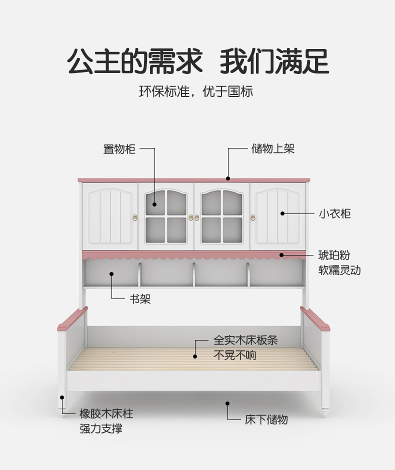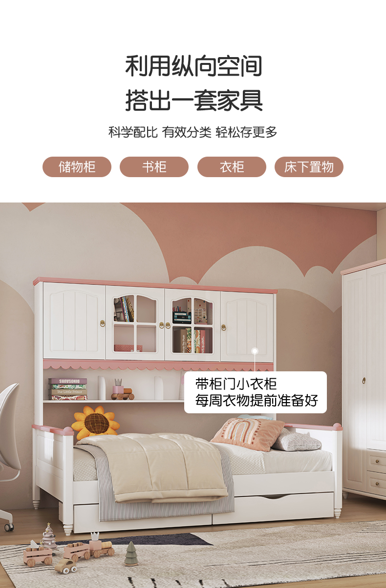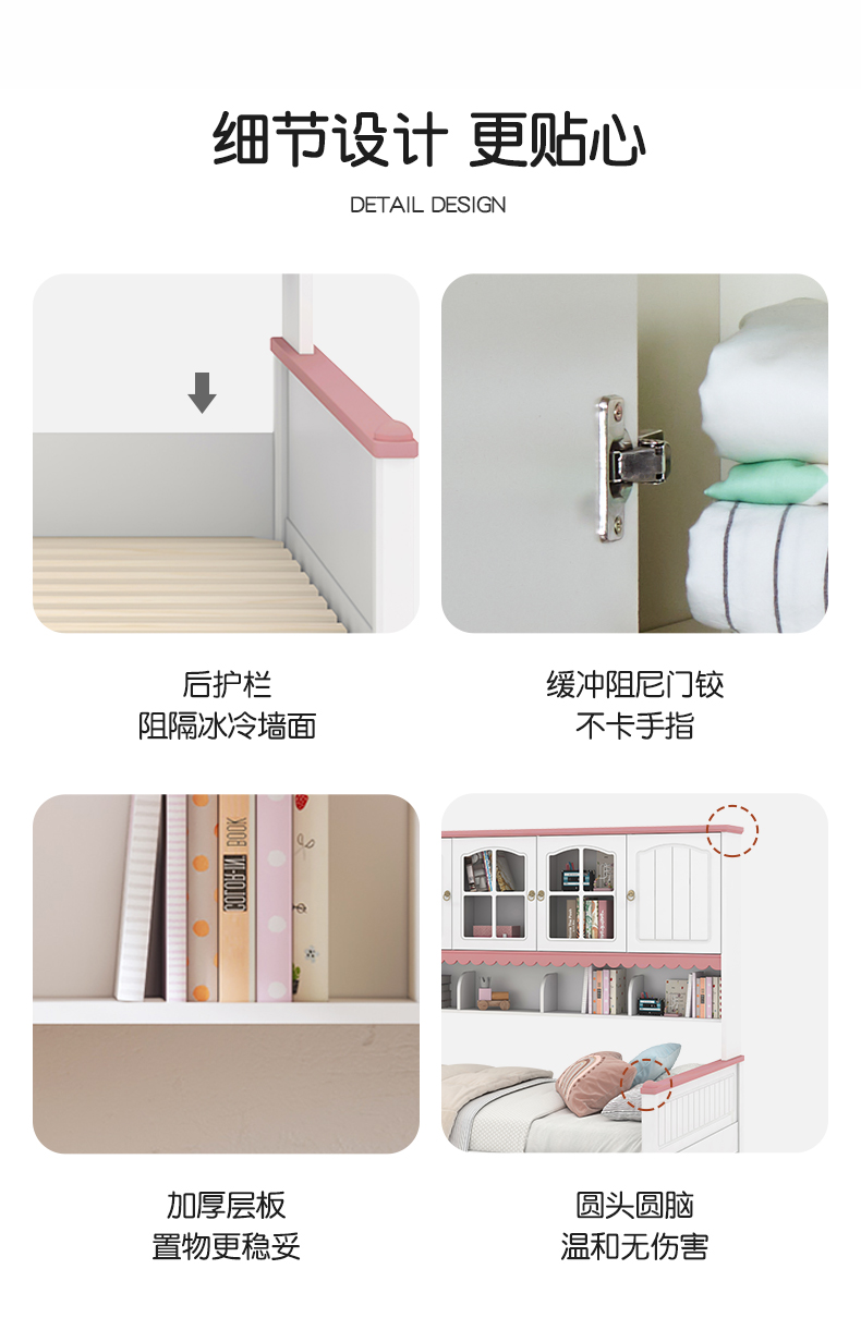 喜梦宝儿童床现代简约书架床多功能储物床粉色女孩卧室侧高床 茉莉系列