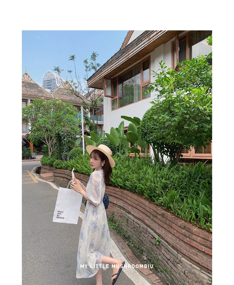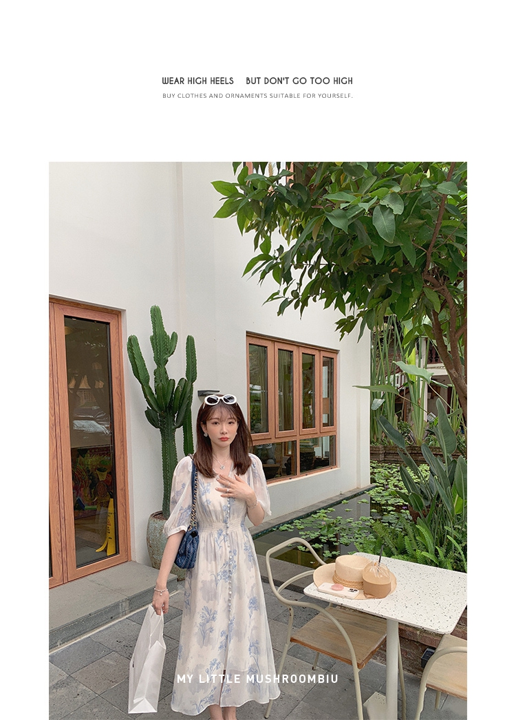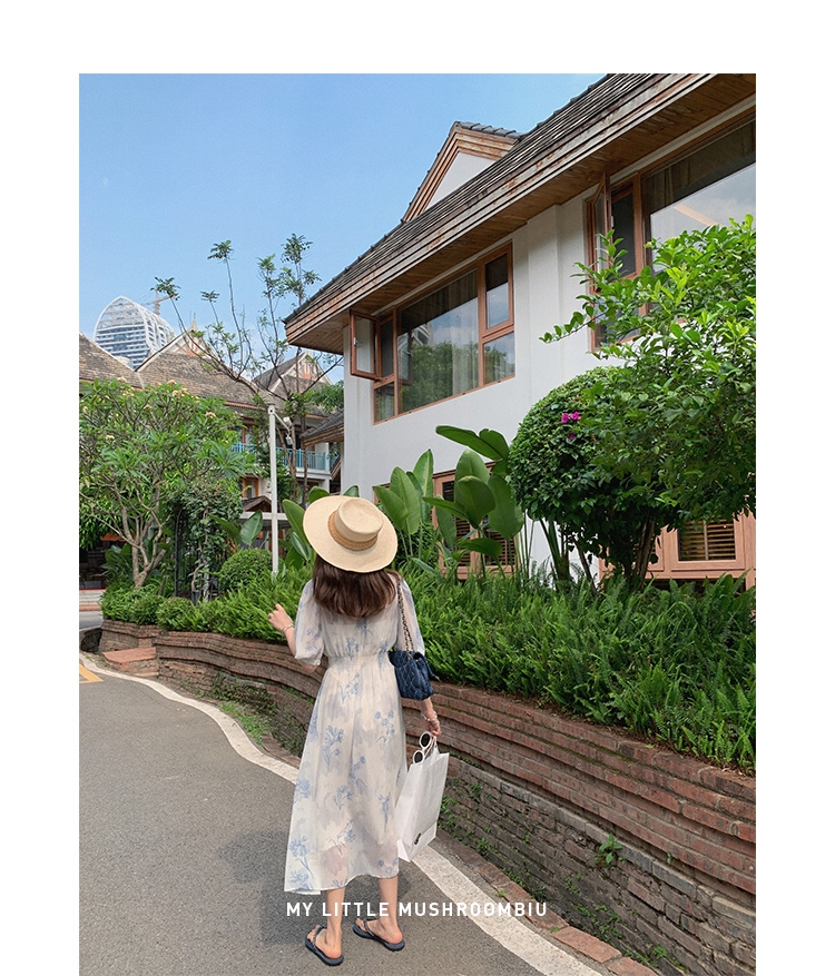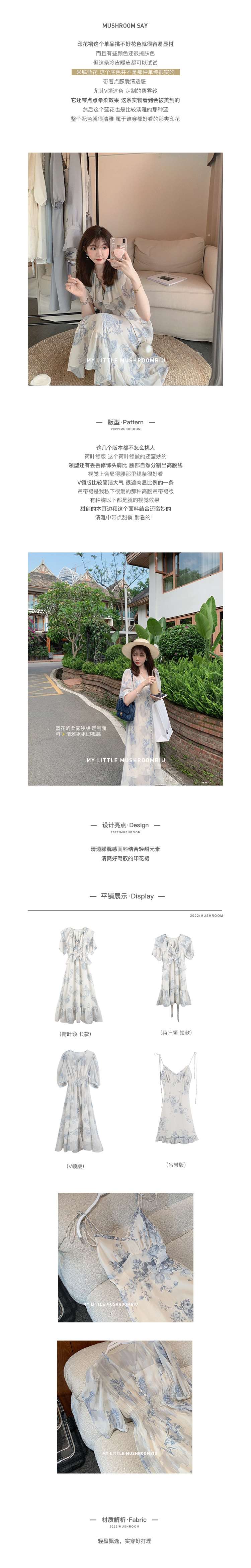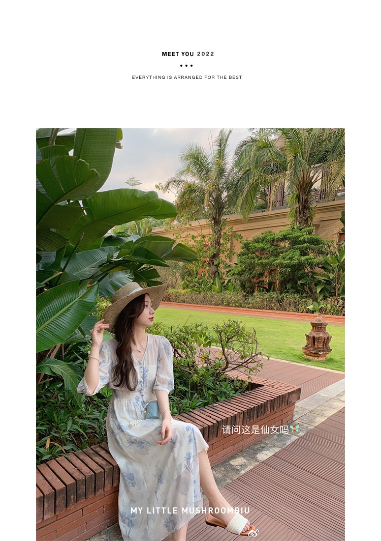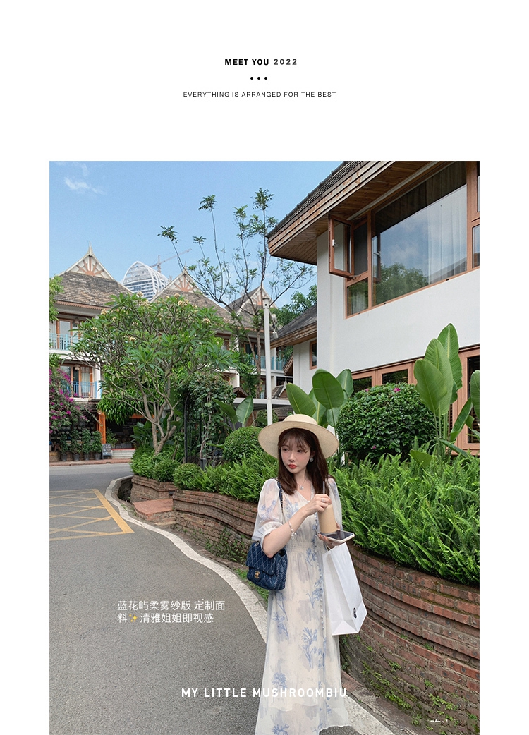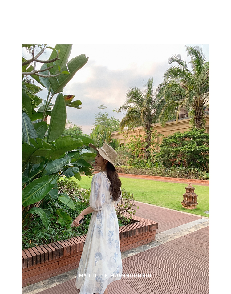 金蘑菇菇【蓝花屿系列】美哭原创油画印花小清新法式温柔风连衣裙